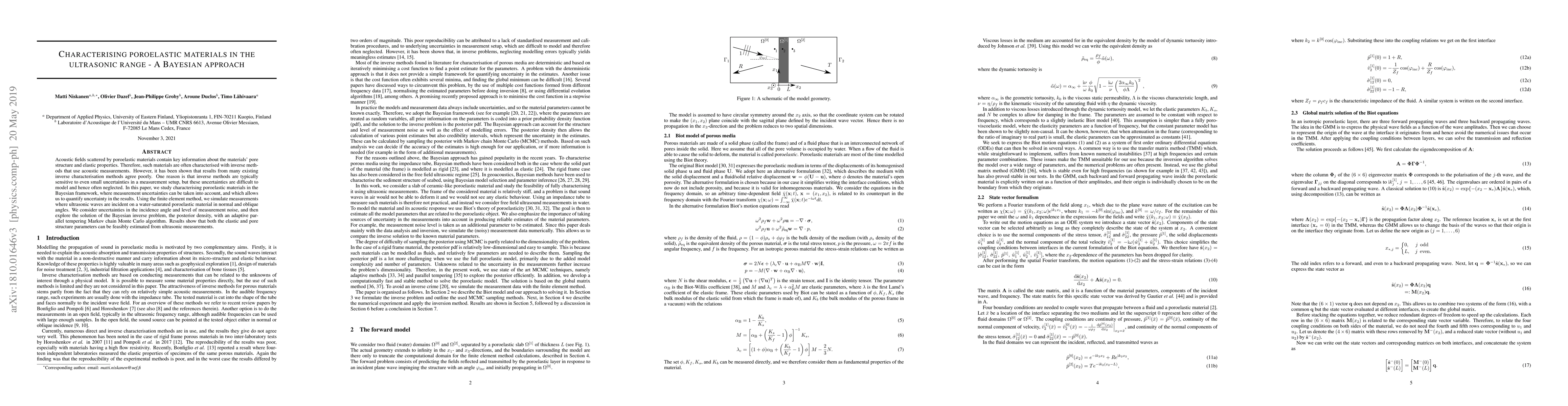 This paper proposes a Bayesian approach to characterise poroelastic materials using ultrasonic waves, accounting for measurement uncertainties and quantifying the resulting uncertainties. Simulation results demonstrate feasible estimation of both elastic and pore structure parameters from ultrasonic measurements.