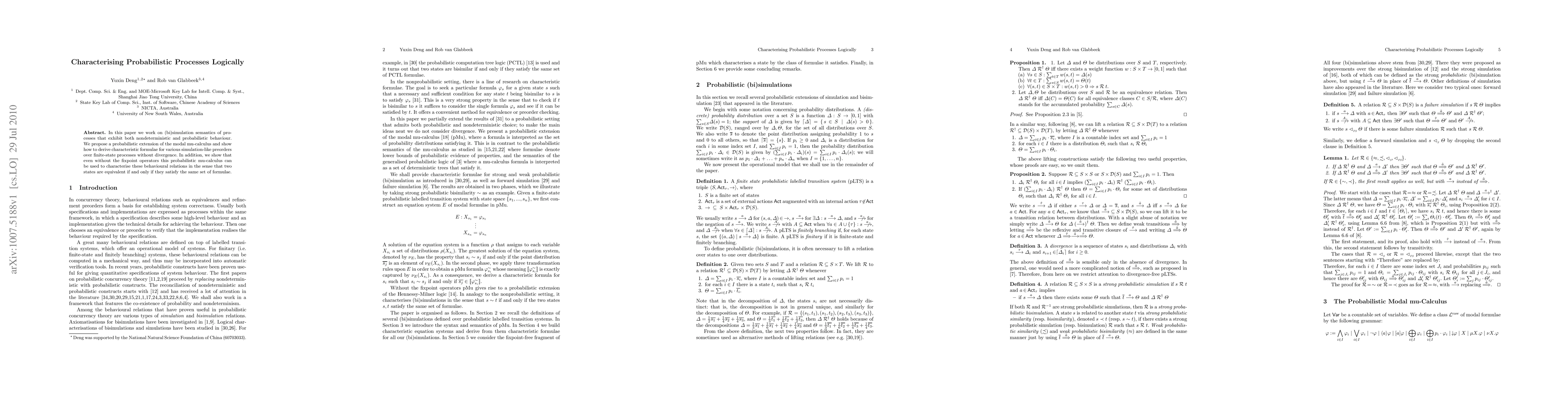 This paper extends the modal mu-calculus to handle probabilistic processes, proposing a new probabilistic version to derive characteristic formulae for simulation-like preorders. It demonstrates that these formulae can characterise equivalence of states without requiring fixpoint operators.