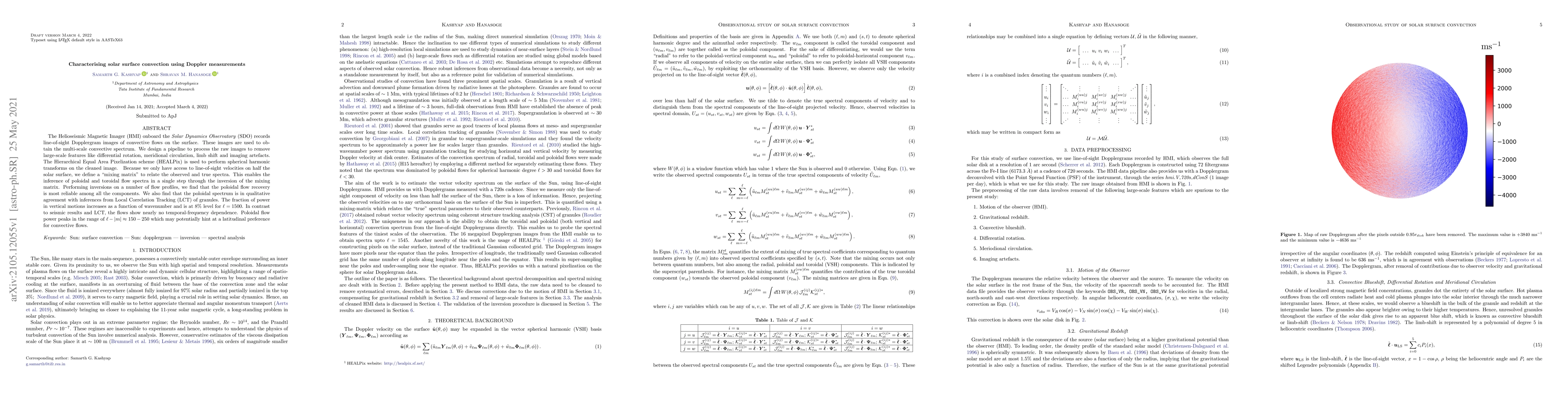The Helioseismic Magnetic Imager (HMI) onboard the Solar Dynamics Observatory (SDO) records line-of-sight Dopplergram images of convective flows on the surface. These images are used to obtain the multi-scale convective spectrum. We design a pipeline to process the raw images to remove large-scale features like differential rotation, meridional circulation, limb shift and imaging artefacts. The Hierarchical Equal Area Pixelization scheme (HEALPix) is used to perform spherical harmonic transforms on the cleaned image. Because we only have access to line-of-sight velocities on half the solar surface, we define a "mixing matrix" to relate the observed and true spectra. This enables the inference of poloidal and toroidal flow spectra in a single step through the inversion of the mixing matrix. Performing inversions on a number of flow profiles, we find that the poloidal flow recovery is most reliable among all the components. We also find that the poloidal spectrum is in qualitative agreement with inferences from Local Correlation Tracking (LCT) of granules. The fraction of power in vertical motions increases as a function of wavenumber and is at 8% level for $\ell = 1500$. In contrast to seismic results and LCT, the flows show nearly no temporal-frequency dependence. Poloidal flow power peaks in the range of $\ell - |m| \approx 150-250$ which may potentially hint at a latitudinal preference for convective flows.