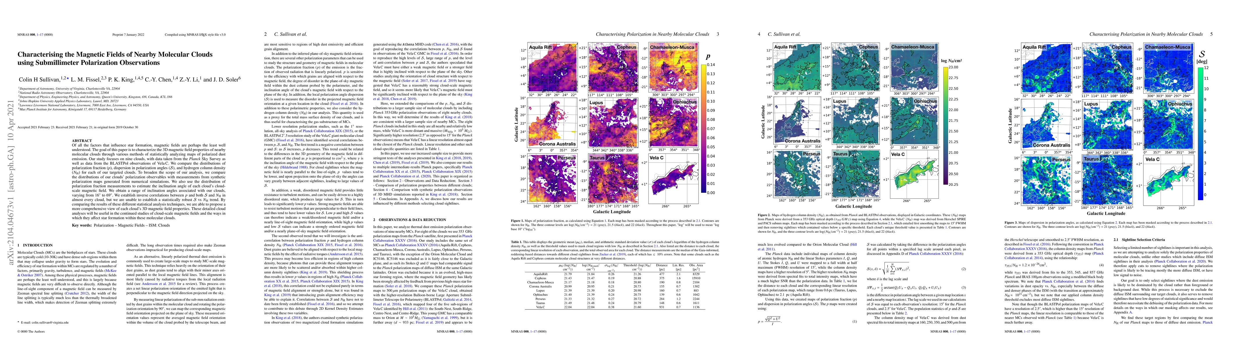 This paper characterizes the three-dimensional magnetic field properties of nine nearby molecular clouds using submillimeter polarization data from the Planck Sky Survey and the Balloon-borne Large Aperture Submillimeter Telescope for Polarimetry. The study reveals inverse correlations between polarization fraction and both dispersion in polarization angles and hydrogen column density, providing insights into the magnetic field's role in star formation.