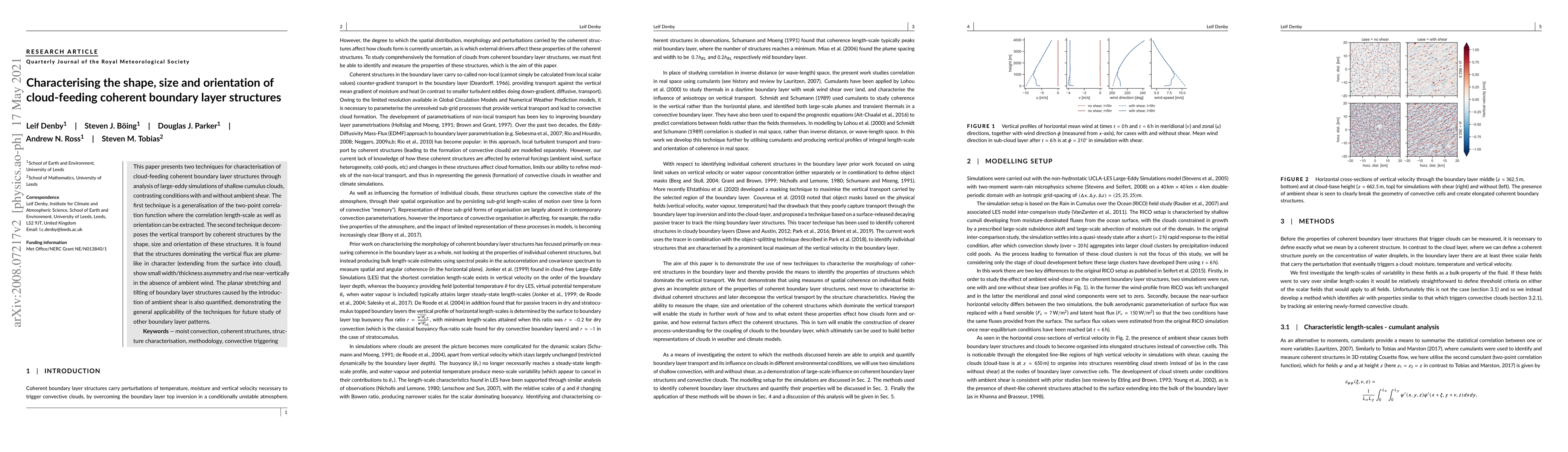 Researchers developed techniques to analyze cloud-feeding boundary layer structures, finding that plume-like shapes with small size asymmetry dominate vertical transport in the absence of wind shear.