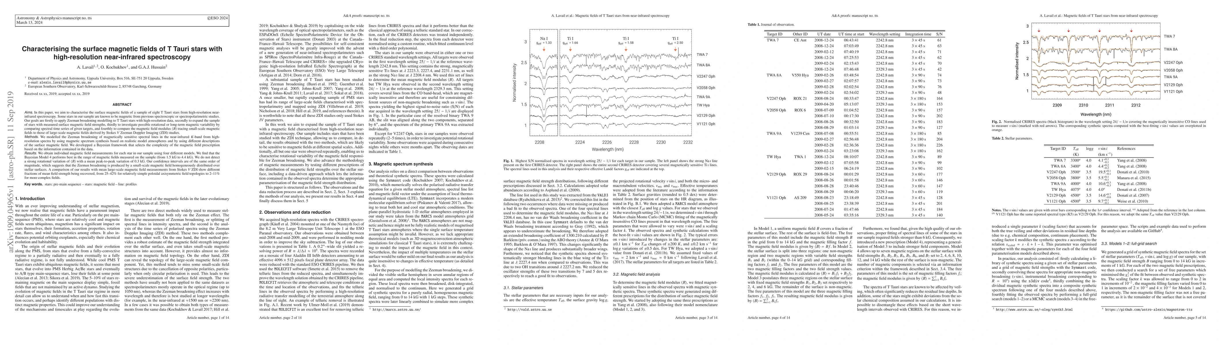 We aim to characterise the surface magnetic fields of a sample of 8 T Tauri stars from high-resolution near-IR spectroscopy. Some stars in our sample are known to be magnetic from previous spectroscopic or spectropolarimetric studies. Our goals are 1) to apply Zeeman broadening modelling to T Tauri stars with high-resolution data, 2) to expand the sample of stars with measured surface magnetic field strengths, 3) to investigate possible rotational or long-term magnetic variability by comparing spectral time series of given targets, and 4) to compare the magnetic field modulus tracing small-scale magnetic fields to those of large-scale magnetic fields derived by Stokes V Zeeman Doppler Imaging. We modelled the Zeeman broadening of magnetically sensitive spectral lines in the near-IR K-band from high-resolution spectra by using magnetic spectrum synthesis based on realistic model atmospheres and by using different descriptions of the surface magnetic field. We developped a Bayesian framework that selects the complexity of the magnetic field prescription based on the information contained in the data. We obtain individual magnetic field measurements for each star in our sample using four different models. We find that the Bayesian Model 4 performs best in the range of magnetic fields measured on the sample (from 1.5 kG to 4.4 kG). We do not detect a strong rotational variation of with a mean peak-to-peak variation of 0.3 kG. Our confidence intervals are of the same order of magnitude, which suggests that the Zeeman broadening is produced by a small-scale magnetic field homogeneously distributed over stellar surfaces. A comparison of our results with mean large-scale magnetic field measurements from Stokes V ZDI show different fractions of mean field strength being recovered, from 25-42% for relatively simple poloidal axisymmetric field topologies to 2-11% for more complex fields.
