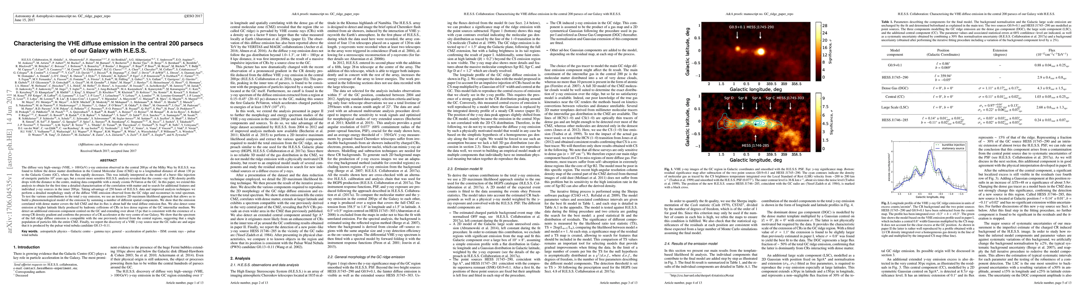 The diffuse very high-energy (VHE, > 100 GeV) gamma-ray emission observed in the central 200 pc of the Milky Way by H.E.S.S. was found to follow the dense matter distribution in the Central Molecular Zone (CMZ) up to a longitudinal distance of about 130 pc to the Galactic Centre (GC), where the flux rapidly decreases. Recent sensitive H.E.S.S. analysis revealed that the cosmic-ray (CR) density profile drops with the distance to the centre, making data compatible with a steady cosmic PeVatron at the GC. In this paper, we extend this analysis to obtain for the first time a detailed characterisation of the correlation with matter and to search for additional features and individual gamma-ray sources in the inner 200 pc. Taking advantage of 250 hours of H.E.S.S. data and improved analysis techniques we perform a detailed morphology study of the diffuse VHE emission observed from the GC ridge and reconstruct its total spectrum. We show that the emission correlated with dense matter covers the full CMZ and that its flux is about half the total diffuse emission flux. We also detect some emission at higher latitude likely produced by hadronic collisions of CRs in less dense regions of the GC interstellar medium. We detect an additional emission component centred on the GC and extending over about 15 pc that is consistent with the existence of a strong CR density gradient and confirms the presence of a CR accelerator at the very centre of our Galaxy. We show that the spectrum of the full ridge diffuse emission is compatible with the one previously derived from the central regions, suggesting that a single population of particles fills the entire CMZ. Finally, we report the discovery of a VHE gamma-ray source near the GC radio arc and argue that it is produced by the pulsar wind nebula candidate G0.13-0.11.