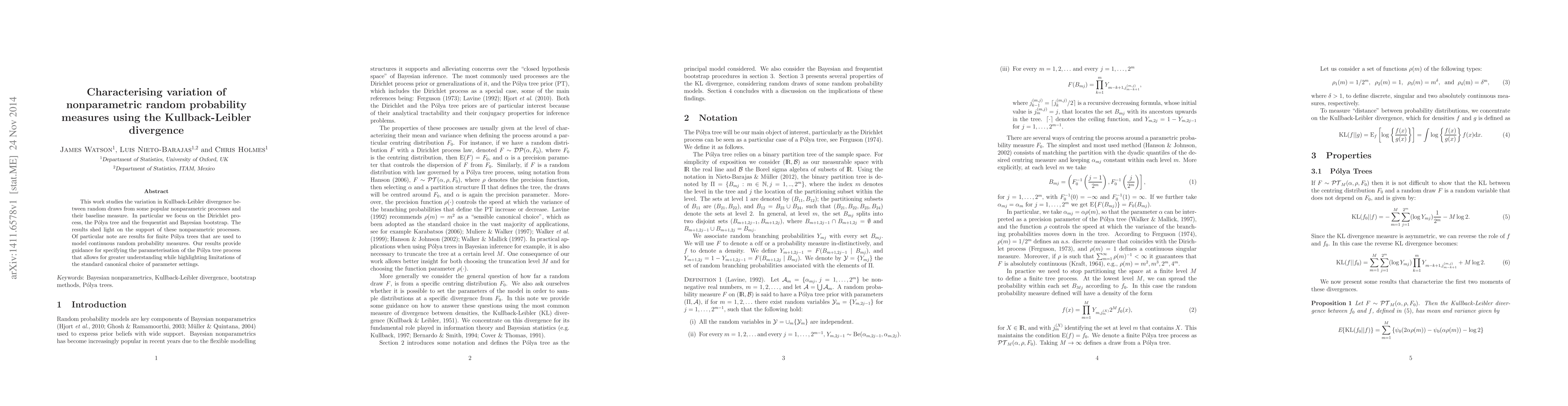 This paper investigates the Kullback-Leibler divergence variation between random draws from nonparametric processes like the Dirichlet process, Pólya tree, and bootstrap methods. It highlights the support characteristics of these processes and particularly critiques the standard parameter settings for finite Pólya trees.