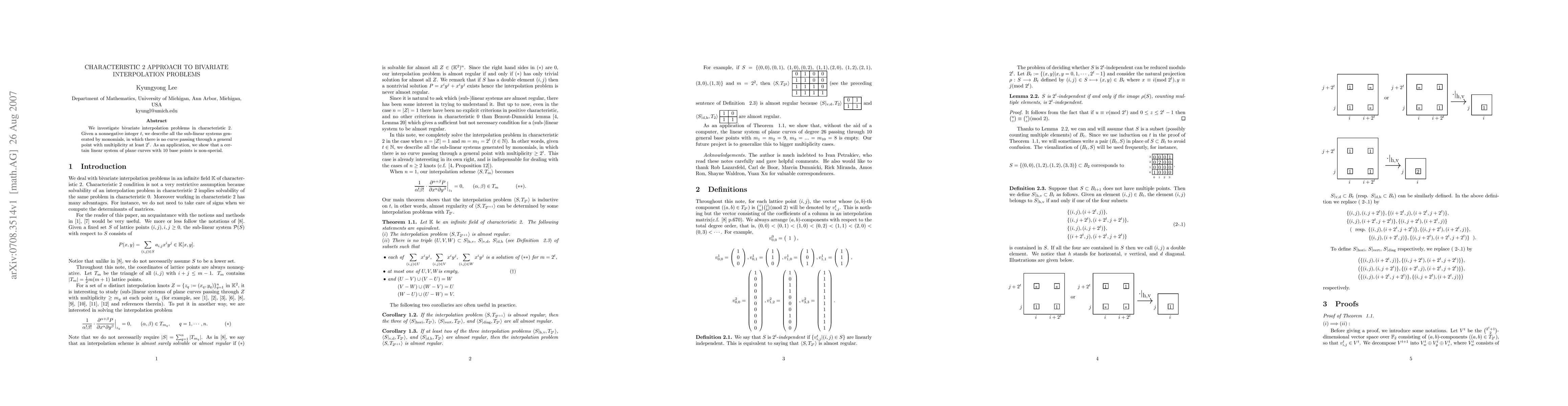 This paper explores bivariate interpolation in characteristic 2, detailing sub-linear systems without curves passing through points with multiplicity greater than $2^t$. It demonstrates that a specific linear system of plane curves with 10 base points is non-special.