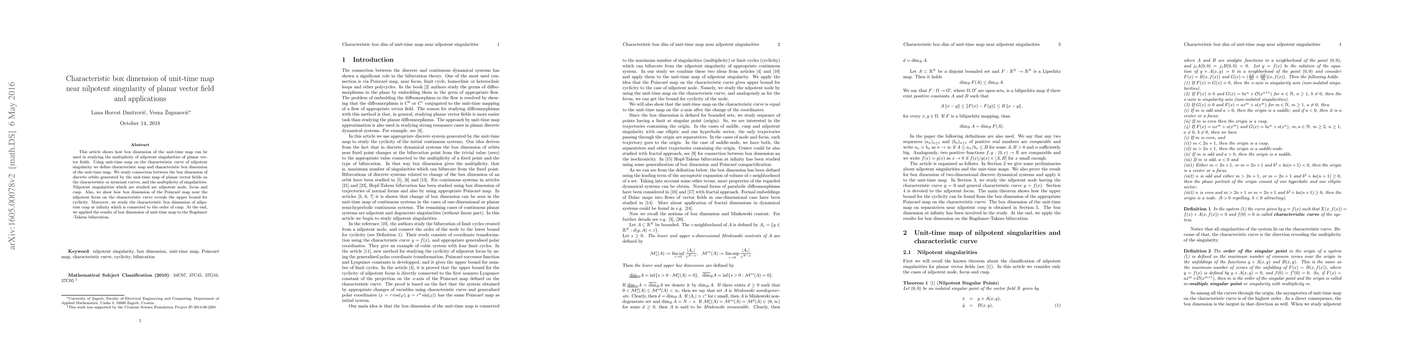 This paper explores the box dimension of the unit-time map near nilpotent singularities in planar vector fields, defining a characteristic box dimension that correlates with the multiplicity of singularities like nodes, foci, and cusps. It also applies these findings to the Bogdanov-Takens bifurcation scenario.