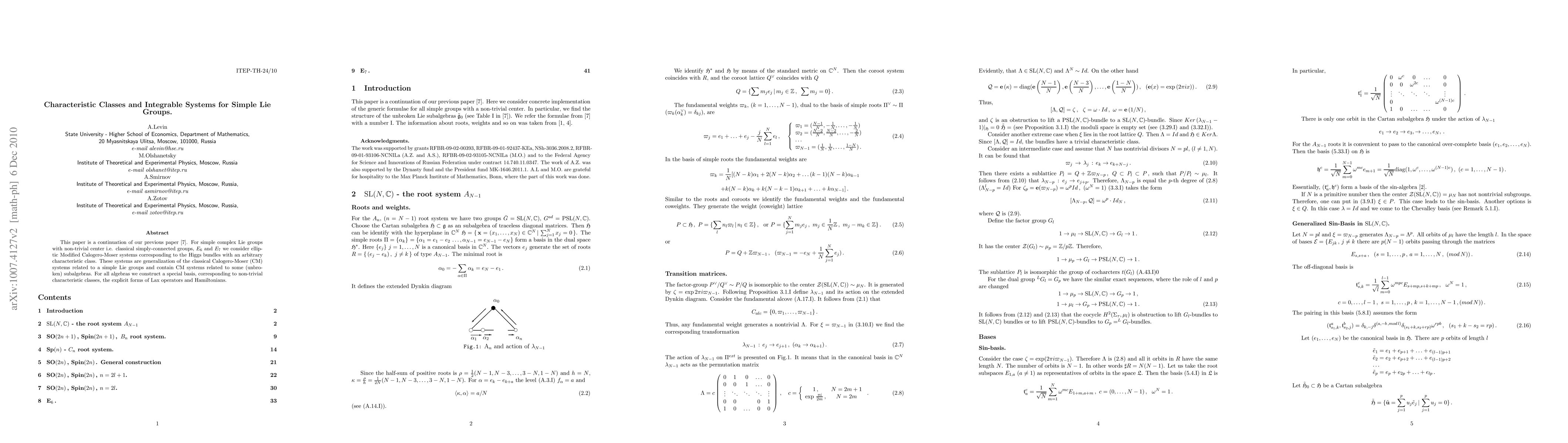This paper is a continuation of our previous paper \cite{LOSZ}. For simple complex Lie groups with non-trivial center, i.e. classical simply-connected groups, $E_6$ and $E_7$ we consider elliptic Modified Calogero-Moser systems corresponding to the Higgs bundles with an arbitrary characteristic class. These systems are generalization of the classical Calogero-Moser (CM) systems related to a simple Lie groups and contain CM systems related to some (unbroken) subalgebras. For all algebras we construct a special basis, corresponding to non-trivial characteristic classes, the explicit forms of Lax operators and Hamiltonians.