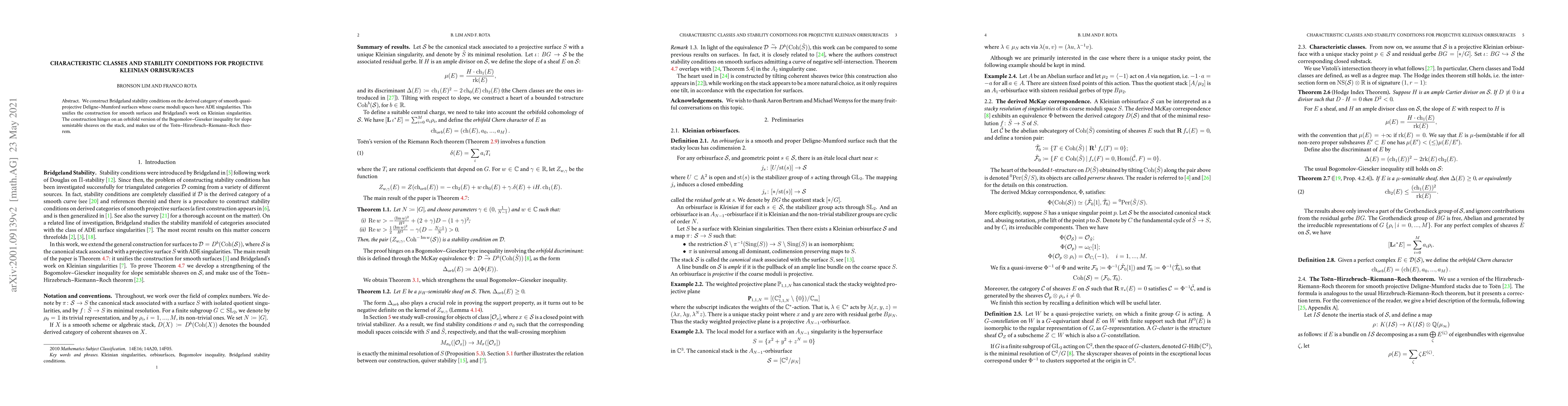 Summary: The paper constructs Bridgeland stability conditions for smooth quasi-projective Deligne-Mumford surfaces with ADE singularities, unifying previous work on smooth surfaces and Kleinian singularities, and employs an orbifold Bogomolov-Gieseker inequality and Toën-Hirzebruch-Riemann-Roch theorem in its construction.