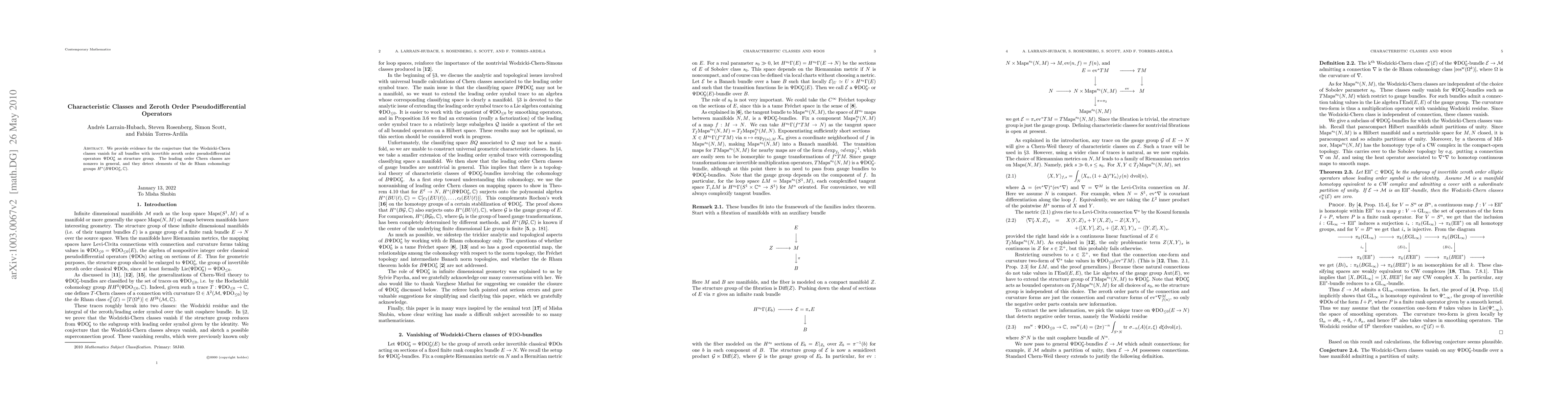 This paper demonstrates that Wodzicki-Chern classes vanish for bundles with the group of invertible zeroth order pseudodifferential operators as structure group, particularly when the group reduces to operators with leading order symbol the identity. It also notes that leading order Chern classes are generally nonzero and relate to de Rham cohomology groups of the classifying space.