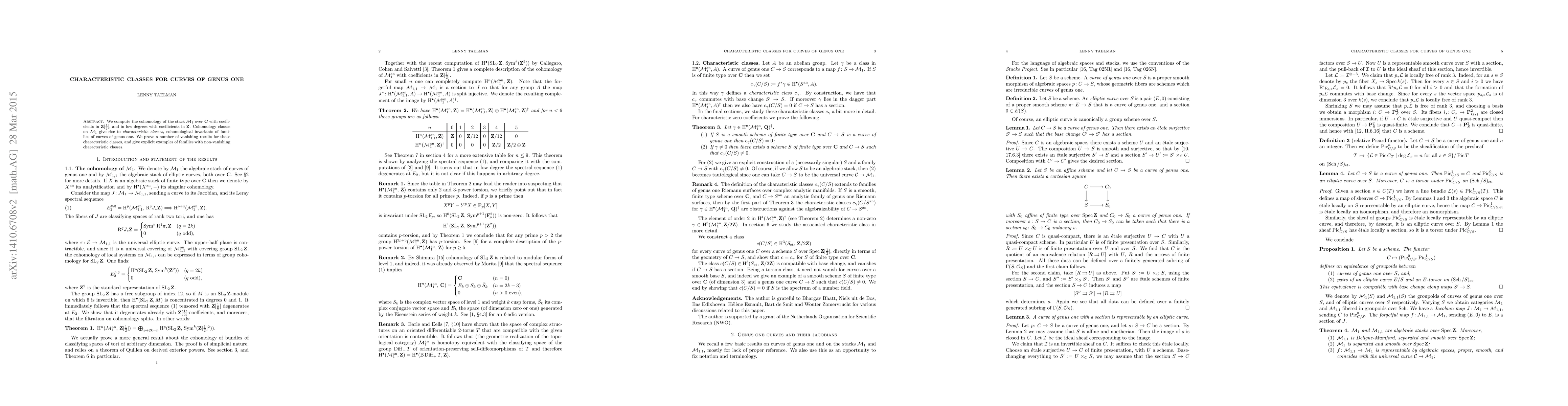 We compute the cohomology of the stack M_1 with coefficients in Z[1/2], and in low degrees with coefficients in Z. Cohomology classes on M_1 give rise to characteristic classes, cohomological invariants of families of curves of genus one. We prove a number of vanishing results for those characteristic classes, and give explicit examples of families with non-vanishing characteristic classes.