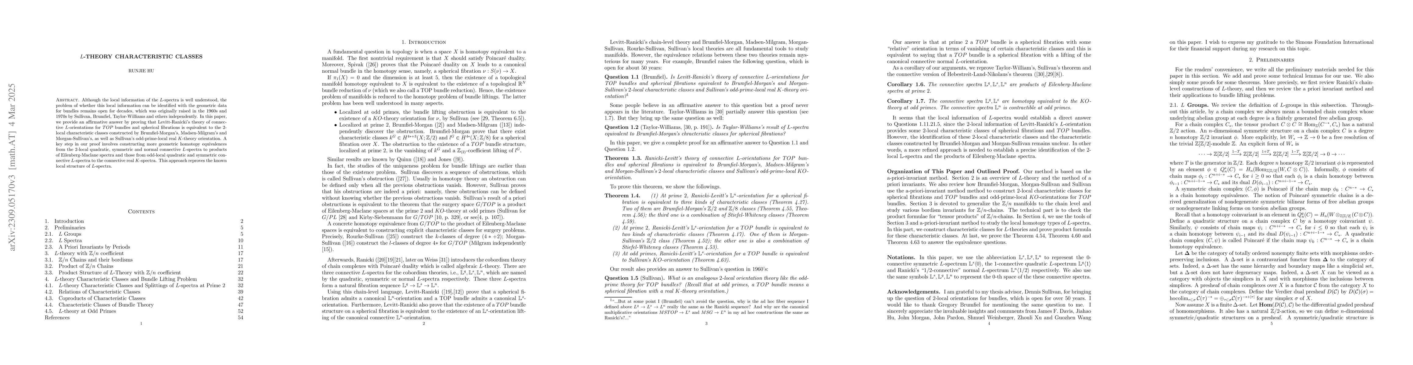 We construct $2$-local characteristic classes and odd-local $KO$-theory characteristic classes of presheaves of Ranicki-Weiss's symmetric, quadratic or normal chains. As a result, we determine the homotopy type of the $L$-theory spaces, which was also proven by Taylor-Williams. We also establish (1) the equivalence between the classes of the surgery space at prime $2$ constructed by Sullivan, Rourke-Sullivan, Morgan-Sullivan, Madsen-Milgram, and the chain-level description by Ranicki; (2) the equivalence between the theory of $TOP$ bundles or spherical fibrations at odd primes by Sullivan and at prime $2$ by Brumfiel-Morgan, Morgan-Sullivan, and the theory of $L$-orientations by Levitt-Ranicki .