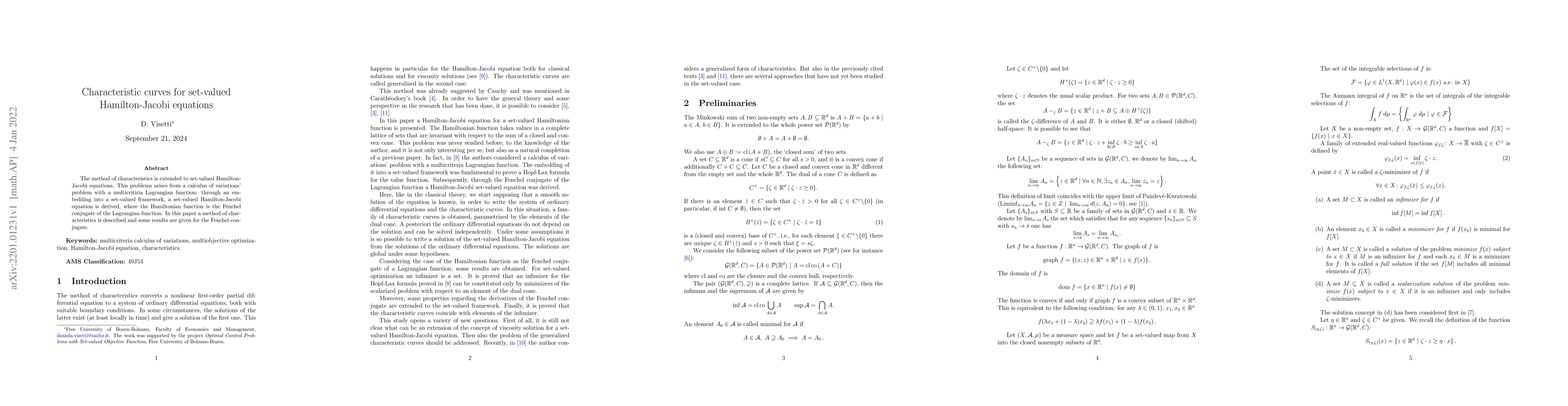 This paper extends the method of characteristics to set-valued Hamilton-Jacobi equations, derived from a multicriteria calculus of variations problem. Results include the application of the method to the Fenchel conjugate of the Lagrangian function.