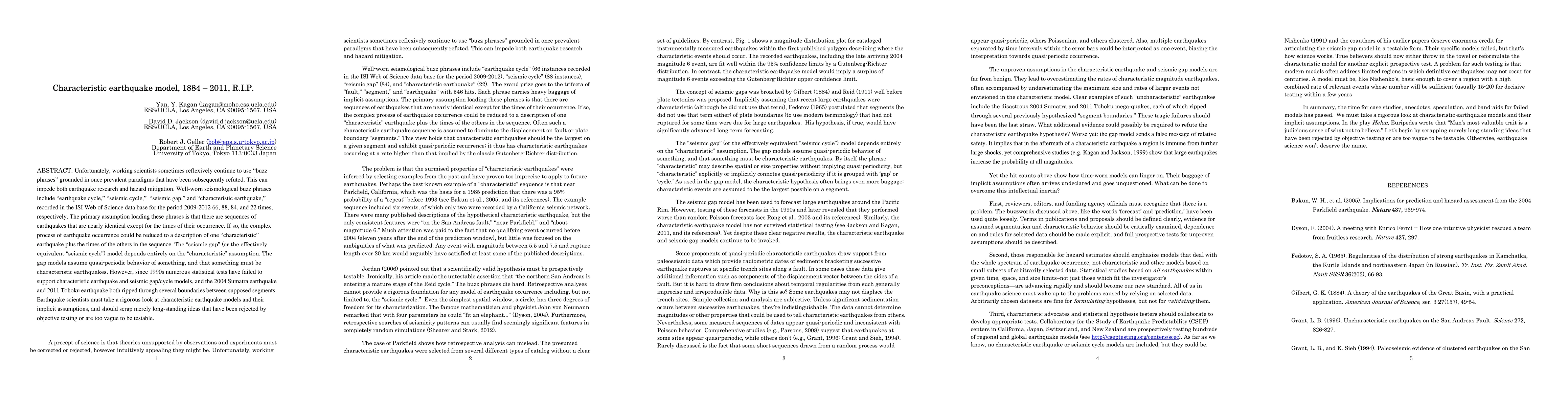 Unfortunately, working scientists sometimes reflexively continue to use "buzz phrases" grounded in once prevalent paradigms that have been subsequently refuted. This can impede both earthquake research and hazard mitigation. Well-worn seismological buzz phrases include "earthquake cycle," "seismic cycle," "seismic gap," and "characteristic earthquake." They all assume that there are sequences of earthquakes that are nearly identical except for the times of their occurrence. If so, the complex process of earthquake occurrence could be reduced to a description of one "characteristic" earthquake plus the times of the others in the sequence. A common additional assumption is that characteristic earthquakes dominate the displacement on fault or plate boundary "segments." The "seismic gap" (or the effectively equivalent "seismic cycle") model depends entirely on the "characteristic" assumption, with the added assumption that characteristic earthquakes are quasi-periodic. However, since the 1990s numerous statistical tests have failed to support characteristic earthquake and seismic gap models, and the 2004 Sumatra earthquake and 2011 Tohoku earthquake both ripped through several supposed segment boundaries. Earthquake scientists should scrap ideas that have been rejected by objective testing or are too vague to be testable.