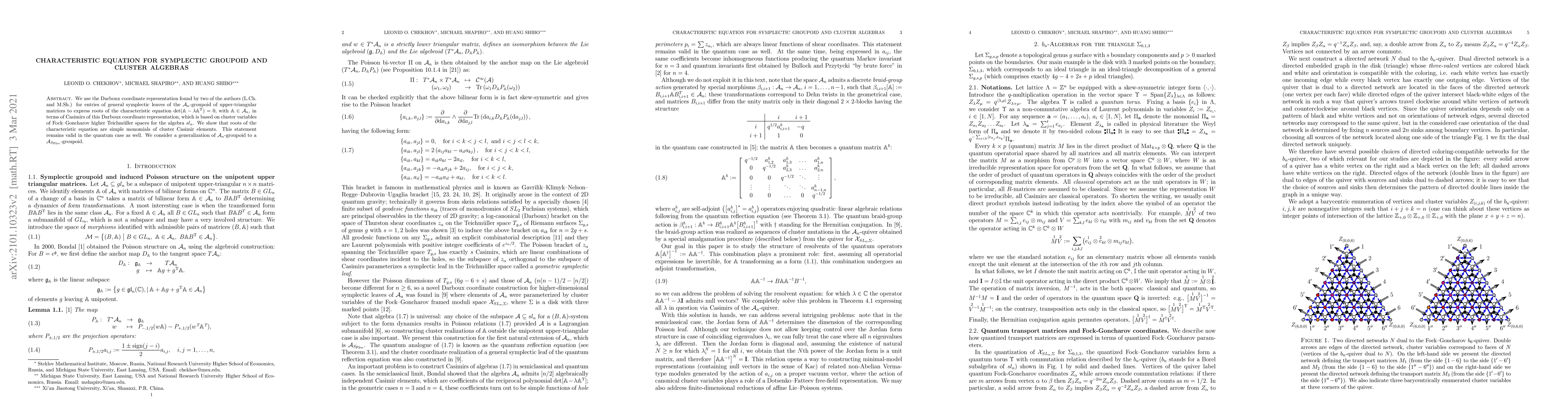 We use the Darboux coordinate representation found by two of the authors (L.Ch. and M.Sh.) for entries of general symplectic leaves of the $\mathcal A_n$-groupoid of upper-triangular matrices to express roots of the characteristic equation $\det(\mathbb A-\lambda \mathbb A^{\text{T}})=0$, with $\mathbb A\in \mathcal A_n$, in terms of Casimirs of this Darboux coordinate representation, which is based on cluster variables of Fock--Goncharov higher Teichm\"uller spaces for the algebra $sl_n$. We show that roots of the characteristic equation are simple monomials of cluster Casimir elements. This statement remains valid in the quantum case as well. We consider a generalization of $\mathcal A_n$-groupoid to a $\mathcal A_{Sp_{2m}}$-groupoid.