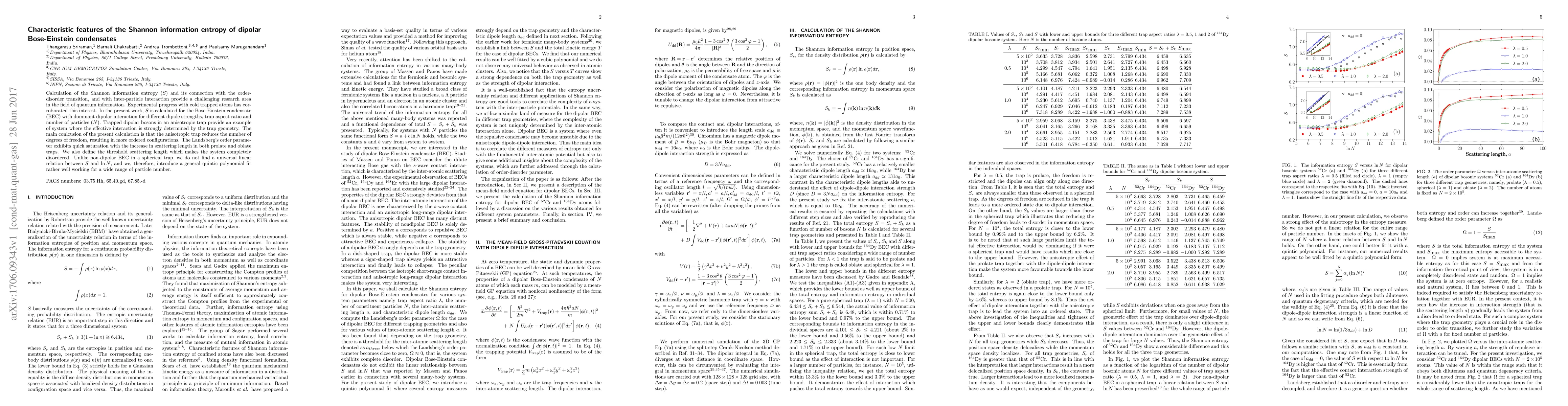 This paper calculates the Shannon information entropy for dipolar Bose-Einstein condensates under various conditions, finding that anisotropic traps lead to more ordered configurations. Unlike non-dipolar BECs, the entropy does not follow a universal linear relation with the logarithm of particle number, instead fitting a general quintic polynomial.