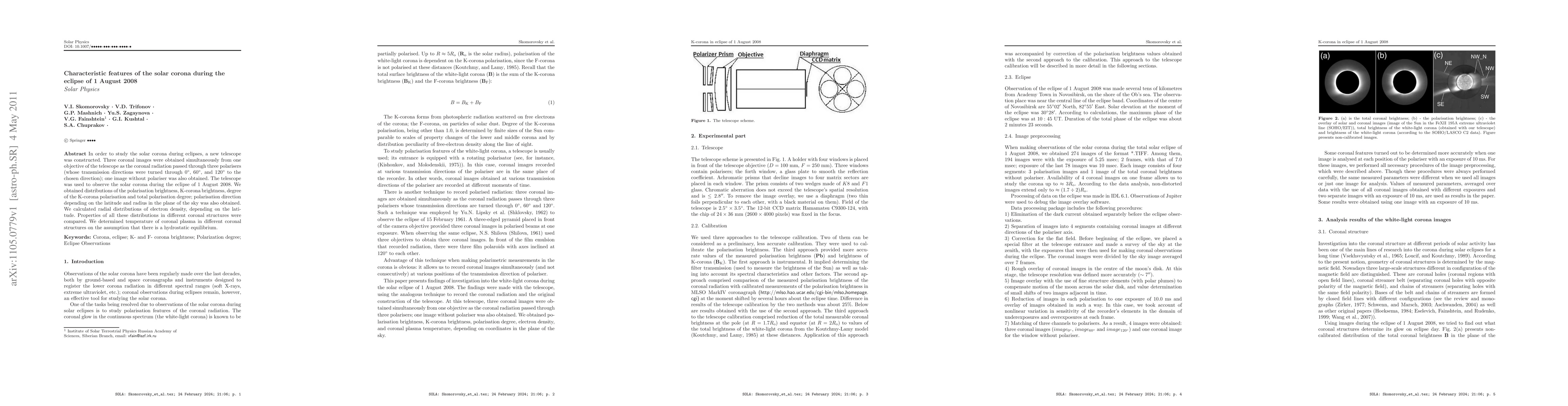 In order to study the solar corona during eclipses, a new telescope was constructed. Three coronal images were obtained simultaneously from one objective of the telescope as the coronal radiation passed through three polarisers (whose transmission directions were turned through 0^{\circ}, 60^{\circ}, and 120^{\circ} to the chosen direction); one image without polariser was also obtained. The telescope was used to observe the solar corona during the eclipse of 1 August 2008. We obtained distributions of the polarisation brightness, K-corona brightness, degree of the K-corona polarisation and total polarisation degree; polarisation direction depending on the latitude and radius in the plane of the sky was also obtained. We calculated radial distributions of electron density, depending on the latitude. Properties of all these distributions in different coronal structures were compared. We determined temperature of coronal plasma in different coronal structures on the assumption that there is a hydrostatic equilibrium.