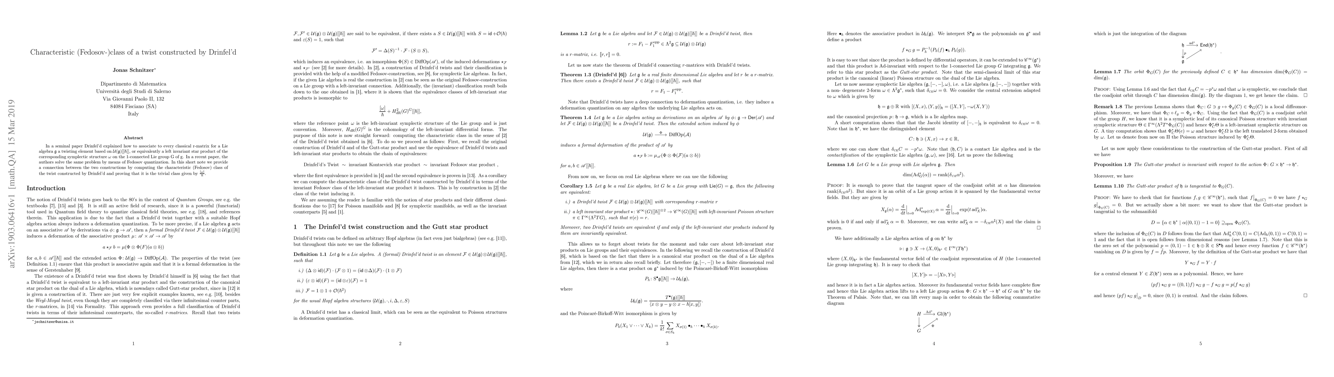 In a seminal paper Drinfel'd explained how to associate to every classical r-matrix for a Lie algebra $\lie g$ a twisting element based on $\mathcal{U}(\lie g)[[\hbar]]$, or equivalently a left invariant star product of the corresponding symplectic structure $\omega$ on the 1-connected Lie group G of g. In a recent paper, the authors solve the same problem by means of Fedosov quantization. In this short note we provide a connection between the two constructions by computing the characteristic (Fedosov) class of the twist constructed by Drinfel'd and proving that it is the trivial class given by $ \frac{[\omega]}{\hbar}$.