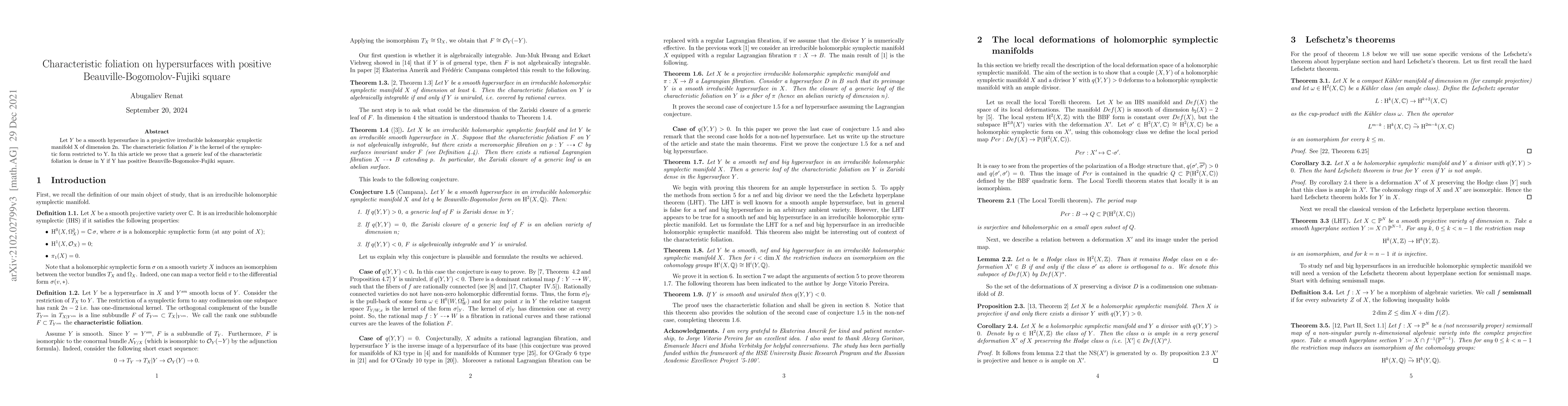 A smooth hypersurface in a 2n-dimensional projective holomorphic symplectic manifold has dense characteristic foliation leaves if its Beauville-Bogomolov-Fujiki square is positive.