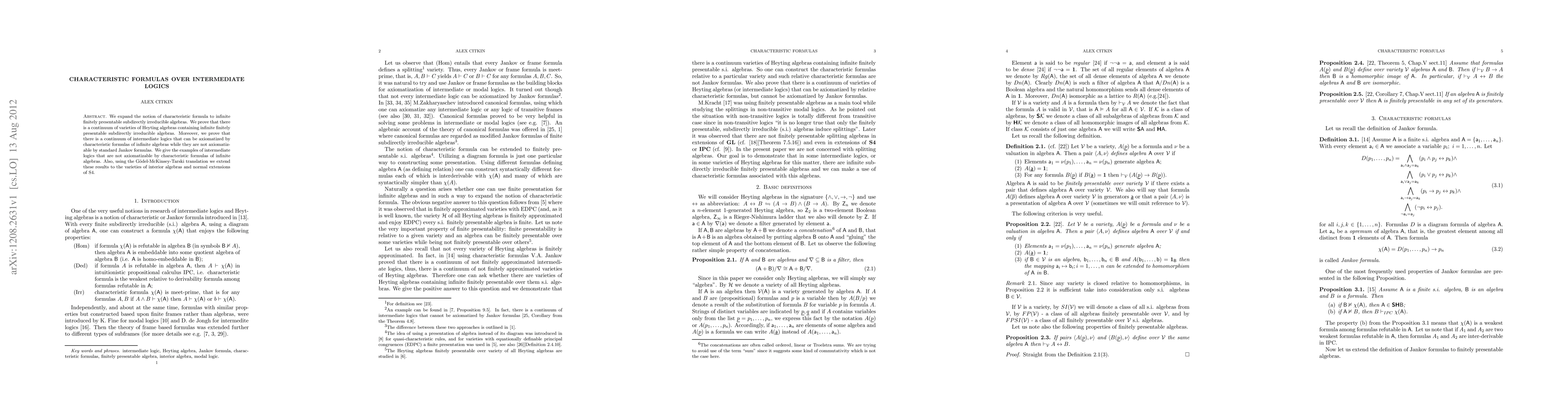 We expand the notion of characteristic formula to infinite finitely presentable subdirectly irreducible algebras. We prove that there is a continuum of varieties of Heyting algebras containing infinite finitely presentable subdirectly irreducible algebras. Moreover, we prove that there is a continuum of intermediate logics that can be axiomatized by characteristic formulas of infinite algebras while they are not axiomatizable by standard Jankov formulas. We give the examples of intermediate logics that are not axiomatizable by characteristic formulas of infinite algebras. Also, using the Goedel-McKinsey-Tarski translation we extend these results to the varieties of interior algebras and normal extensions of S4