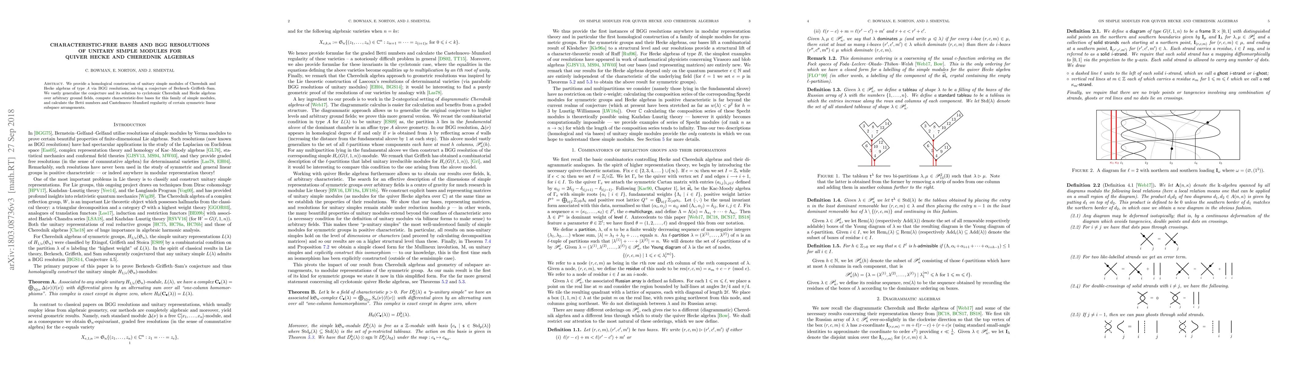 We construct characteristic-free bases and BGG resolutions of unitary simple modules of quiver Hecke algebras and Cherednik algebras. We hence solve and vastly generalise Berkesch-Griffeth-Sam's conjecture, calculate the Castelnuovo-Mumford regularity of ideals of of certain highly symmetric linear subspace arrangements, and compute Dirac homology of Cherednik algebras.