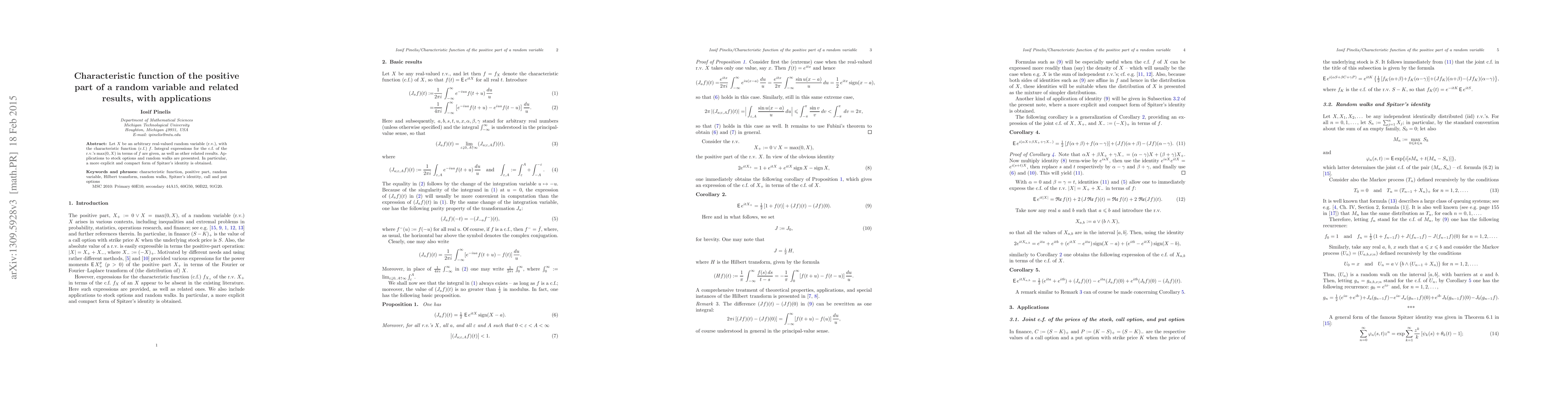 Let $X$ be an arbitrary real-valued random variable (r.v.), with the characteristic function (c.f.) $f$. Integral expressions for the c.f.\ of the r.v.'s $\max(0,X)$ in terms of $f$ are given, as well as other related results. Applications to stock options and random walks are presented. In particular, a more explicit and compact form of Spitzer's identity is obtained.