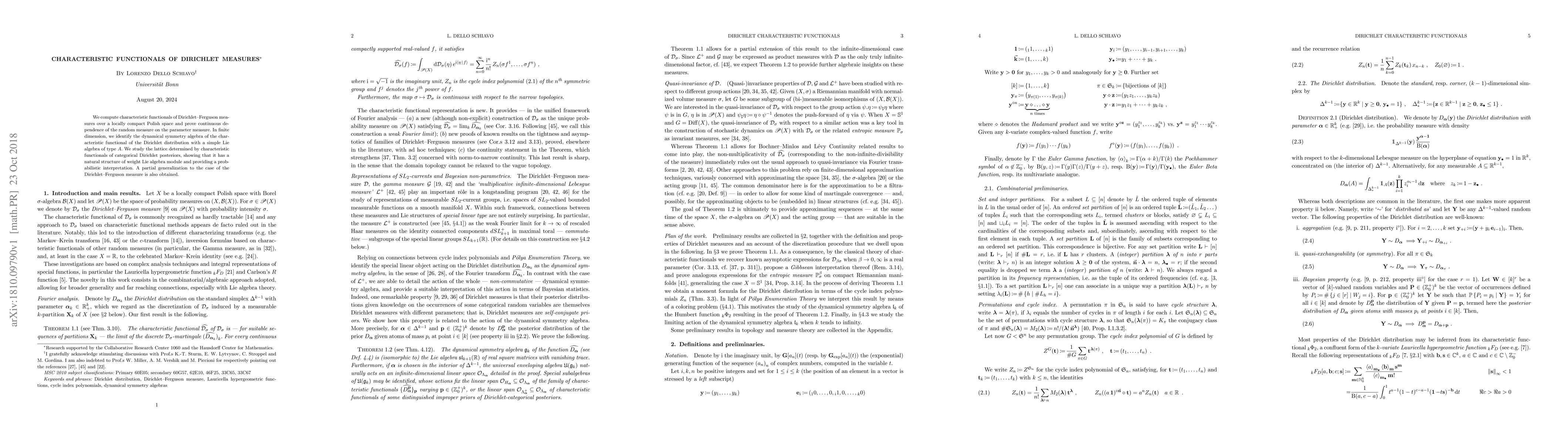 We compute characteristic functionals of Dirichlet-Ferguson measures over a locally compact Polish space and prove continuous dependence of the random measure on the parameter measure. In finite dimension, we identify the dynamical symmetry algebra of the characteristic functional of the Dirichlet distribution with a simple Lie algebra of type $A$. We study the lattice determined by characteristic functionals of categorical Dirichlet posteriors, showing that it has a natural structure of weight Lie algebra module and providing a probabilistic interpretation. A partial generalization to the case of the Dirichlet-Ferguson measure is also obtained.