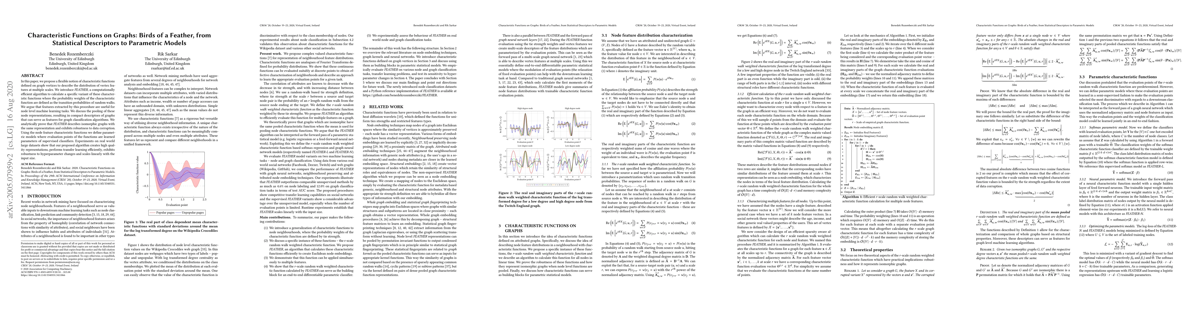 In this paper, we propose a flexible notion of characteristic functions defined on graph vertices to describe the distribution of vertex features at multiple scales. We introduce FEATHER, a computationally efficient algorithm to calculate a specific variant of these characteristic functions where the probability weights of the characteristic function are defined as the transition probabilities of random walks. We argue that features extracted by this procedure are useful for node level machine learning tasks. We discuss the pooling of these node representations, resulting in compact descriptors of graphs that can serve as features for graph classification algorithms. We analytically prove that FEATHER describes isomorphic graphs with the same representation and exhibits robustness to data corruption. Using the node feature characteristic functions we define parametric models where evaluation points of the functions are learned parameters of supervised classifiers. Experiments on real world large datasets show that our proposed algorithm creates high quality representations, performs transfer learning efficiently, exhibits robustness to hyperparameter changes, and scales linearly with the input size.