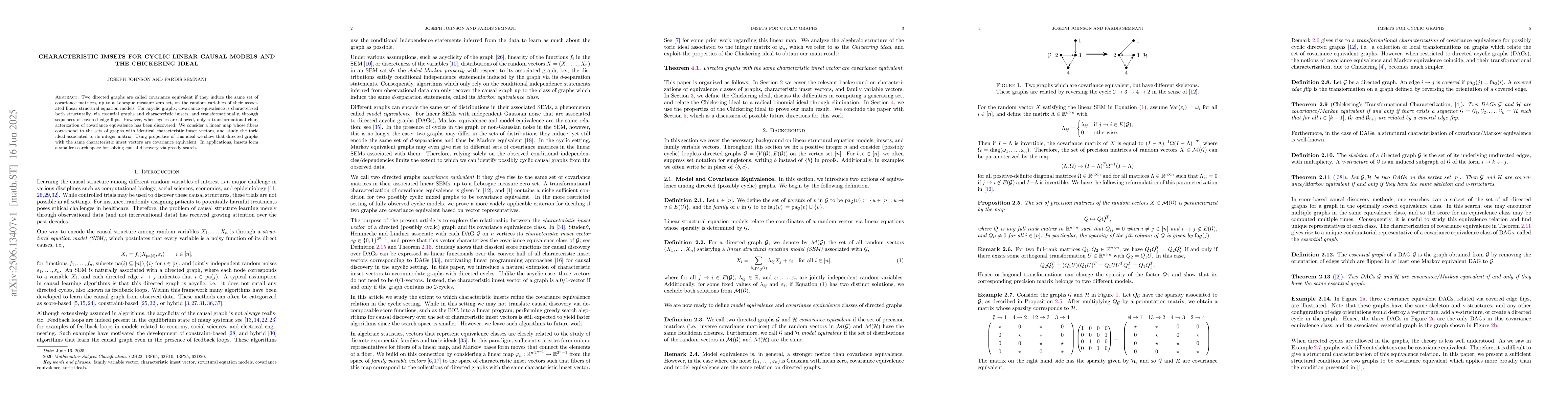 Two directed graphs are called covariance equivalent if they induce the same set of covariance matrices, up to a Lebesgue measure zero set, on the random variables of their associated linear structural equation models. For acyclic graphs, covariance equivalence is characterized both structurally, via essential graphs and characteristic imsets, and transformationally, through sequences of covered edge flips. However, when cycles are allowed, only a transformational characterization of covariance equivalence has been discovered. We consider a linear map whose fibers correspond to the sets of graphs with identical characteristic imset vectors, and study the toric ideal associated to its integer matrix. Using properties of this ideal we show that directed graphs with the same characteristic imset vectors are covariance equivalent. In applications, imsets form a smaller search space for solving causal discovery via greedy search.