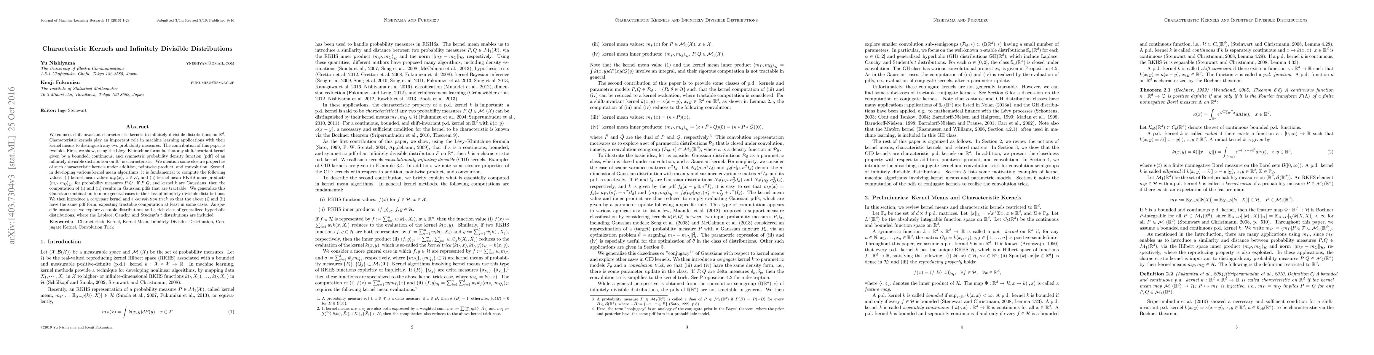 This paper connects shift-invariant characteristic kernels to infinitely divisible distributions on $\mathbb{R}^{d}$, demonstrating that such kernels are characteristic via the L\'evy-Khintchine formula. It also generalizes Gaussian kernel mean computations to infinitely divisible distributions, introducing a conjugate kernel and convolution trick for tractable computation.