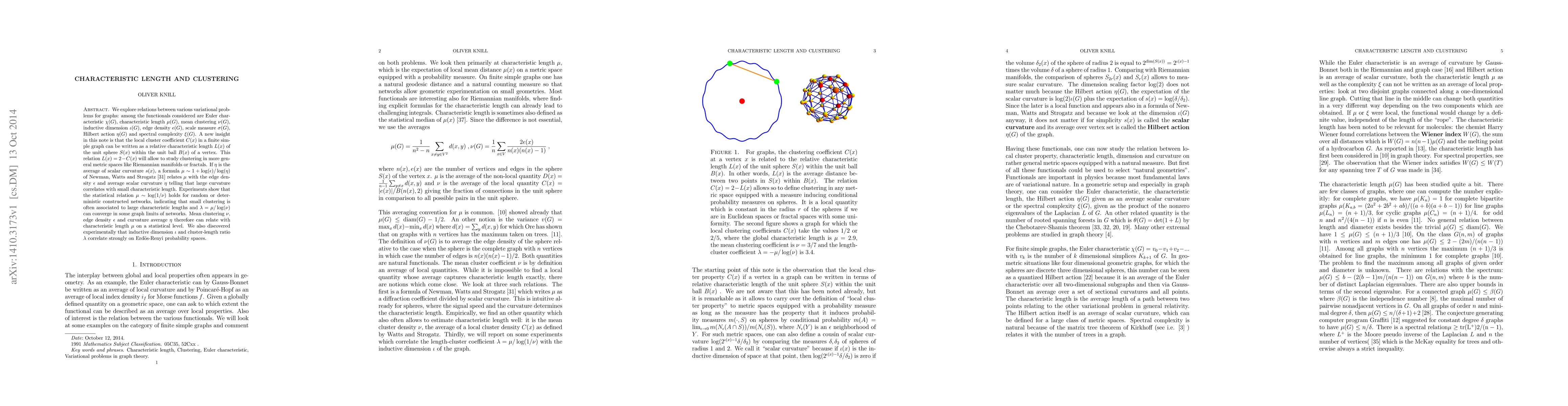 We explore relations between various variational problems for graphs like Euler characteristic chi(G), characteristic length mu(G), mean clustering nu(G), inductive dimension iota(G), edge density epsilon(G), scale measure sigma(G), Hilbert action eta(G) and spectral complexity xi(G). A new insight in this note is that the local cluster coefficient C(x) in a finite simple graph can be written as a relative characteristic length L(x) of the unit sphere S(x) within the unit ball B(x) of a vertex. This relation L(x) = 2-C(x) will allow to study clustering in more general metric spaces like Riemannian manifolds or fractals. If eta is the average of scalar curvature s(x), a formula mu ~ 1+log(epsilon)/log(eta) of Newman, Watts and Strogatz relates mu with the edge density epsilon and average scalar curvature eta telling that large curvature correlates with small characteristic length. Experiments show that the statistical relation mu ~ log(1/nu) holds for random or deterministic constructed networks, indicating that small clustering is often associated to large characteristic lengths and lambda=mu/log(nu) can converge in some graph limits of networks. Mean clustering nu, edge density epsilon and curvature average eta therefore can relate with characteristic length mu on a statistical level. We also discovered experimentally that inductive dimension iota and cluster-length ratio lambda correlate strongly on Erdos-Renyi probability spaces.
