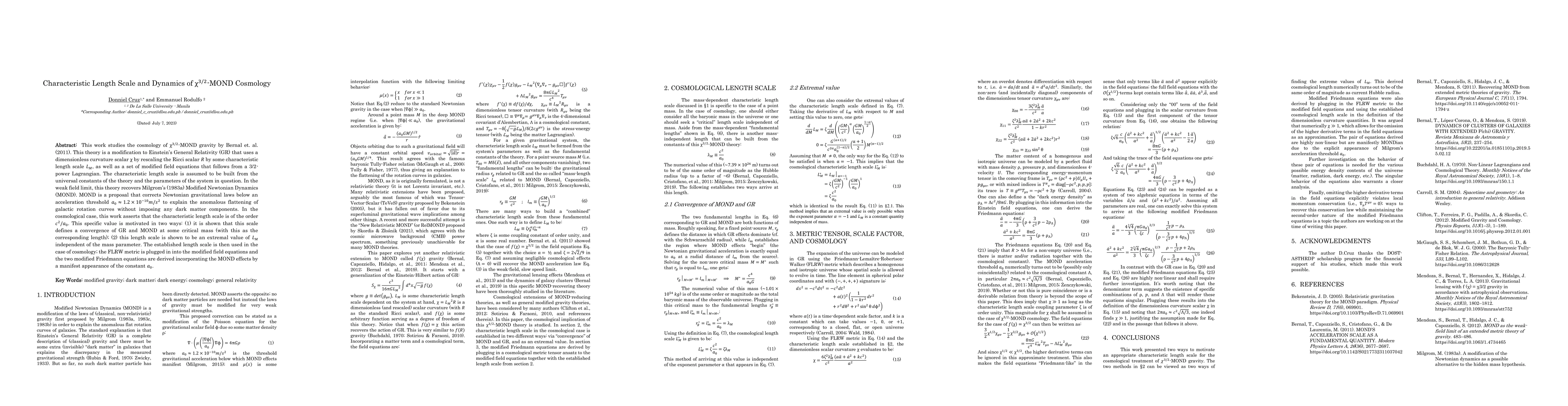 This paper explores the cosmology of $\chi^{3/2}$-MOND, a modified gravity theory that incorporates a characteristic length scale $L_M$ to reconcile General Relativity with Modified Newtonian Dynamics (MOND). The derived modified Friedmann equations show the influence of MOND effects through the constant $a_0$, providing a cosmological framework that converges GR and MOND at a critical mass.