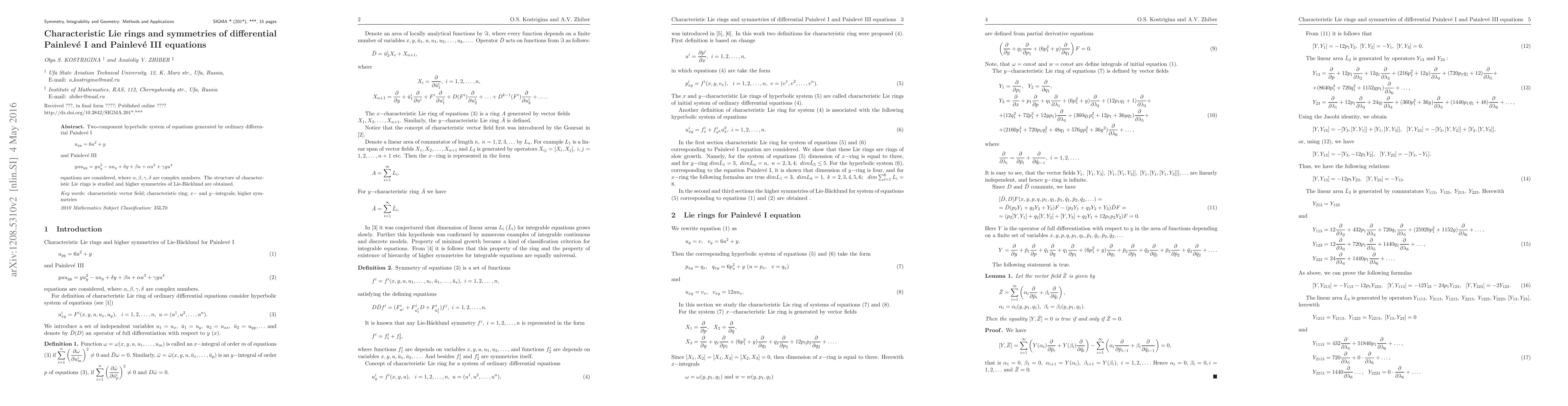 Two-component hyperbolic system of equations generated by ordinary differential Painlev\'e I \[ u_{yy}=6u^2+y \] and Painlev\'e III \[ yuu_{yy}=yu^2_{y}-uu_y+\delta y+\beta u+\alpha u^3 +\gamma yu^4 \] equations are considered, where $\alpha, \beta, \gamma, \delta$ are complex numbers. The structure of characteristic Lie rings is studied and higher symmetries of Lie-B\"acklund are obtained.