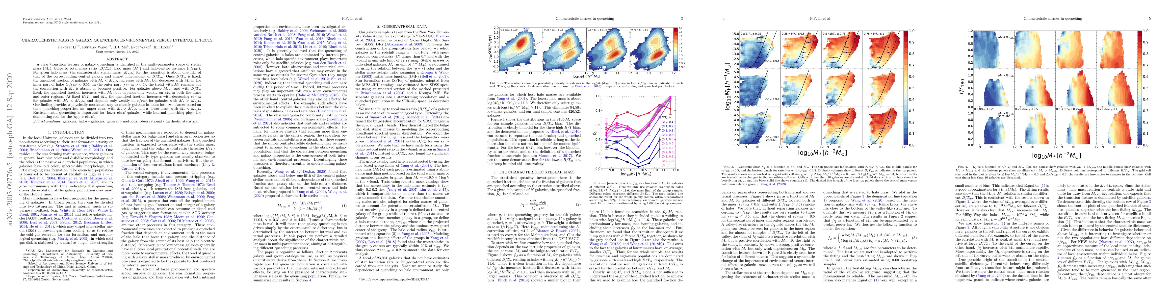 A clear transition feature of galaxy quenching is identified in the multi-parameter space of stellar mass ($M_*$), bulge to total mass ratio ($B/T_{\rm m}$), halo mass ($M_{\rm h}$) and halo-centric distance ($r/r_{180}$). For given halo mass, the characteristic stellar mass ($M_{*, \rm ch}$) for the transition is about one-fifth of that of the corresponding central galaxy, and almost independent of $B/T_{\rm m}$. Once $B/T_{\rm m}$ is fixed, the quenched fraction of galaxies with $M_{*} < M_{*, \rm ch}$ increases with $M_{\rm h}$, but decreases with $M_*$ in the inner part of halos ($r/r_{180} < 0.5$). In the outer part ($r/r_{180} > 0.5$), the trend with $M_{\rm h}$ remains but the correlation with $M_*$ is absent or becomes positive. For galaxies above $M_{\rm *, ch}$ and with $B/T_{\rm m}$ fixed, the quenched fraction increases with $M_{\rm *}$, but depends only weakly on $M_{\rm h}$ in both the inner and outer regions. At fixed $B/T_{\rm m}$ and $M_*$, the quenched fraction increases with decreasing $r/r_{180}$ for galaxies with $M_{*} < M_{*, \rm ch}$, and depends only weakly on $r/r_{180}$ for galaxies with $M_{*} > M_{*, \rm ch}$. Our finding provides a physically-motivated way to classify galaxies in halos into two classes based on their quenching properties: an `upper class' with $M_{*} > M_{\rm *,ch}$ and a `lower class' with $M_{*} < M_{\rm *,ch}$. Environmental quenching is important for `lower class' galaxies, while internal quenching plays the dominating role for the `upper class'.