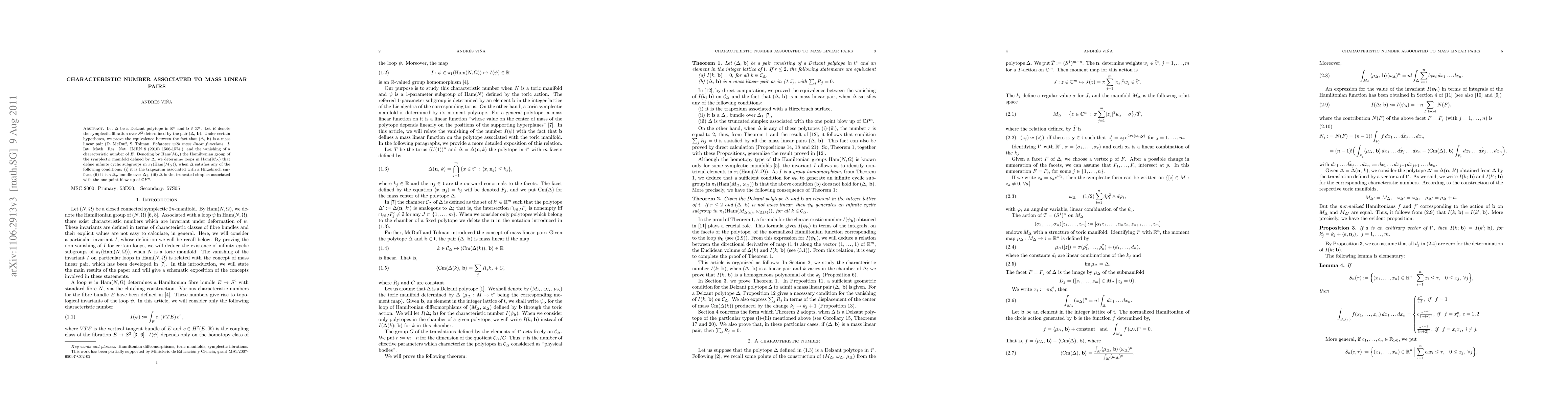 Let $\Delta$ be a Delzant polytope in ${\mathbb R}^n$ and ${\mathbf b}\in{\mathbb Z}^n$. Let $E$ denote the symplectic fibration over $S^2$ determined by the pair $(\Delta,\,{\mathbf b})$. Under certain hypotheses, we prove the equivalence between the fact that $(\Delta,\,{\mathbf b})$ is a mass linear pair (D. McDuff, S. Tolman, {\em Polytopes with mass linear functions. I.} Int. Math. Res. Not. IMRN 8 (2010) 1506-1574.) and the vanishing of a characteristic number of $E$. Denoting by ${\rm Ham}(M_{\Delta})$ the Hamiltonian group of the symplectic manifold defined by $\Delta$, we determine loops in ${\rm Ham}(M_{\Delta})$ that define infinite cyclic subgroups in $\pi_1({\rm Ham}(M_{\Delta}))$, when $\Delta$ satisfies any of the following conditions: (i) it is the trapezium associated with a Hirzebruch surface, (ii) it is a $\Delta_p$ bundle over $\Delta_1$, (iii) $\Delta$ is the truncated simplex associated with the one point blow up of ${\mathbb C}P^n$.