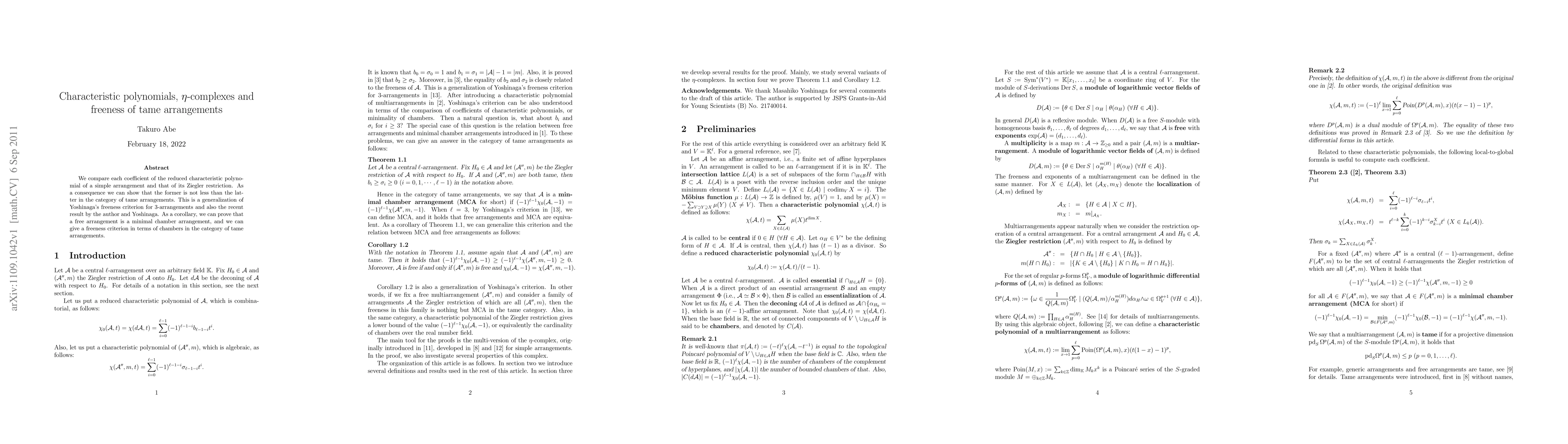 We compare each coefficient of the reduced characteristic polynomial of a simple arrangement and that of its Ziegler restriction. As a consequence we can show that the former is not less than the latter in the category of tame arrangements. This is a generalization of Yoshinaga's freeness criterion for 3-arrangements and also the recent result by the author and Yoshinaga. As a corollary, we can prove that a free arrangement is a minimal chamber arrangement, and we can give a freeness criterion in terms of chambers in the category of tame arrangements.