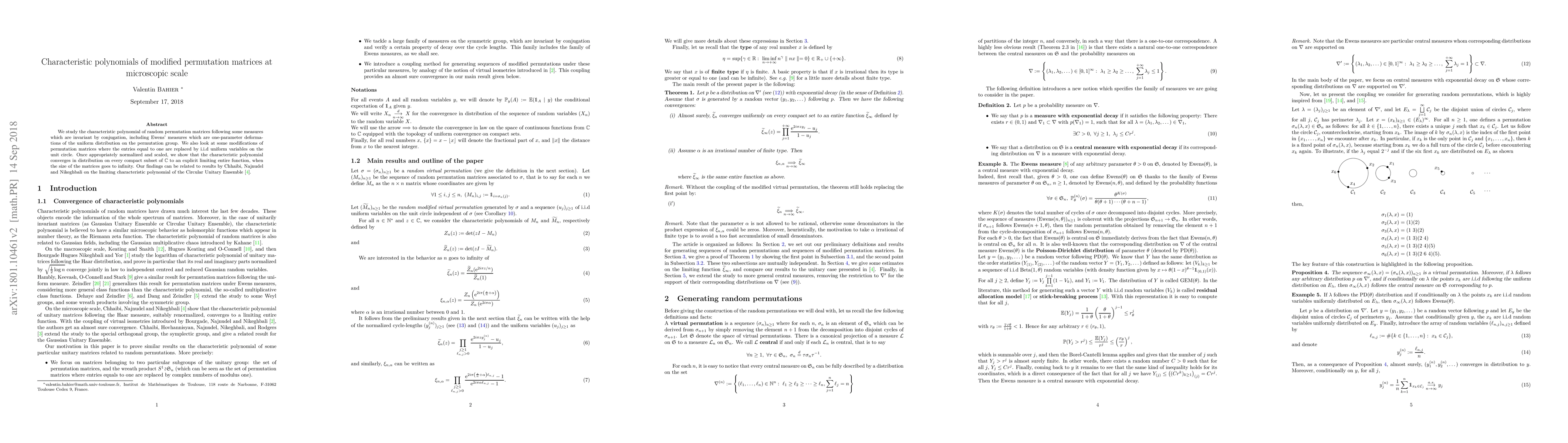 This paper investigates the characteristic polynomial of modified permutation matrices, showing that under certain scaling, it converges to an explicit limiting function as the matrix size increases. The study extends to random permutation matrices under Ewens' measures and modified matrices with entries replaced by uniform variables on the unit circle, linking findings to the Circular Unitary Ensemble.