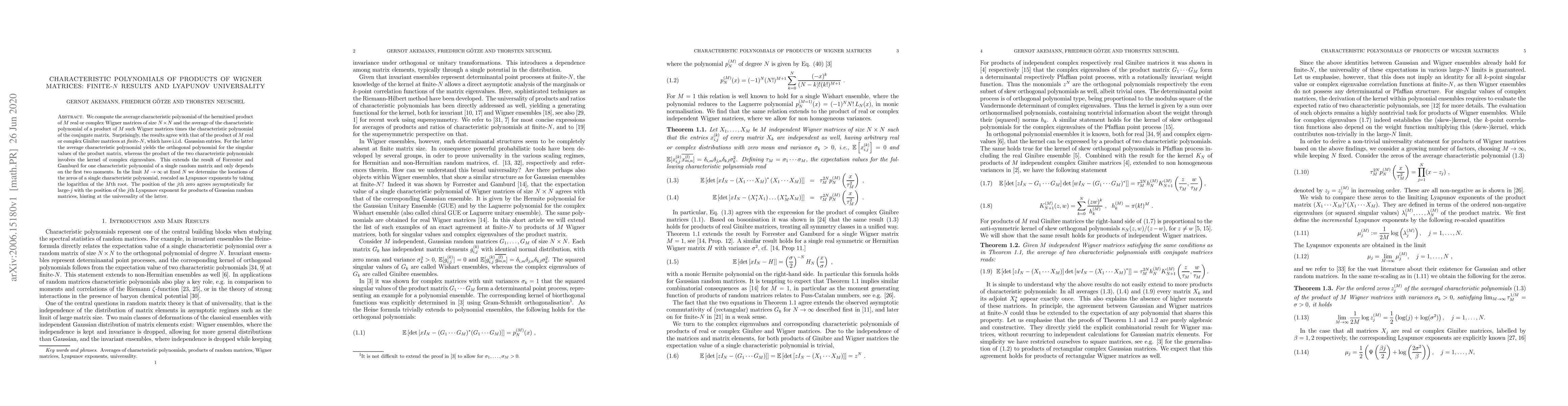 This research paper finds that characteristic polynomials of products of Wigner matrices agree with those of Ginibre matrices at finite-N, extending a previous result to two characteristic polynomials, and hints at Lyapunov universality for Gaussian random matrices.
