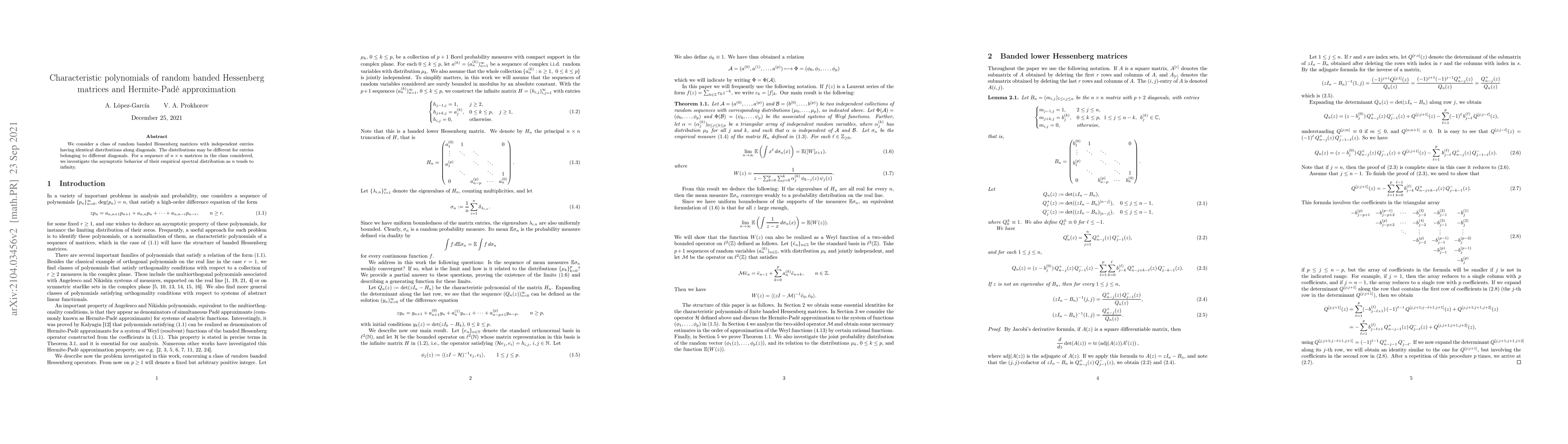 This paper studies the asymptotic behavior of the empirical spectral distribution of random banded Hessenberg matrices with independent identically distributed entries along diagonals, focusing on their characteristic polynomials and Hermite-Padé approximation. The analysis reveals trends as the matrix size $n$ approaches infinity.