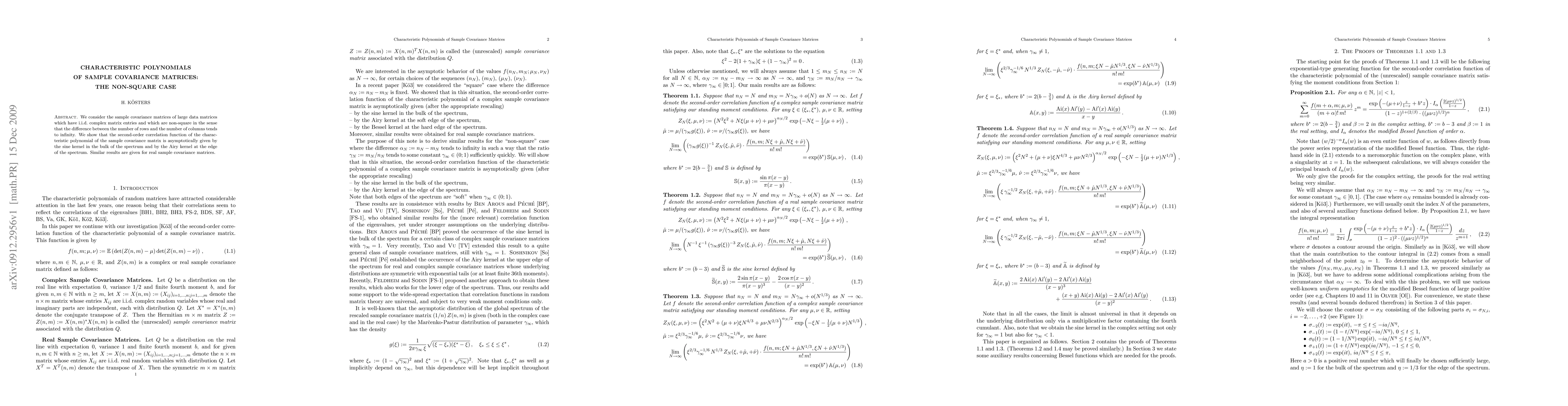 This paper investigates the characteristic polynomials of large non-square sample covariance matrices with i.i.d. complex or real matrix entries. It demonstrates that the second-order correlation function of these polynomials is asymptotically described by the sine kernel in the bulk and the Airy kernel at the edge of the spectrum.