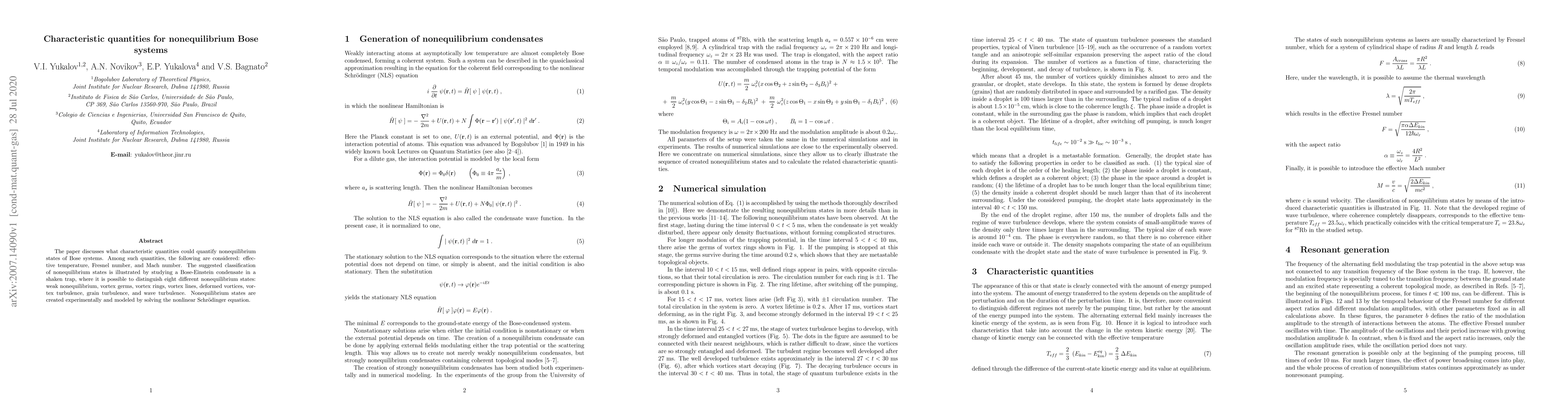 The paper discusses what characteristic quantities could quantify nonequilibrium states of Bose systems. Among such quantities, the following are considered: effective temperature, Fresnel number, and Mach number. The suggested classification of nonequilibrium states is illustrated by studying a Bose-Einstein condensate in a shaken trap, where it is possible to distinguish eight different nonequilibrium states: weak nonequilibrium, vortex germs, vortex rings, vortex lines, deformed vortices, vortex turbulence, grain turbulence, and wave turbulence. Nonequilibrium states are created experimentally and modeled by solving the nonlinear Schr\"odinger equation.