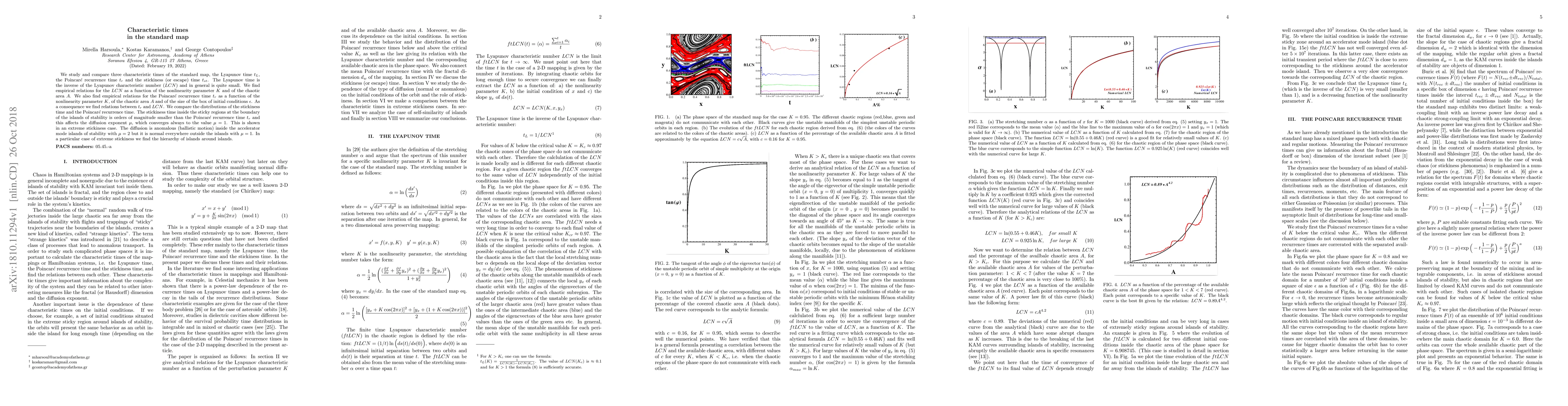 This paper investigates three characteristic times in the standard map: the Lyapunov time, the Poincare recurrence time, and the stickiness time. Empirical relations for the Lyapunov and Poincare recurrence times are derived, revealing that the stickiness time is much smaller, affecting the diffusion exponent which converges to 1, except in the ballistic motion regions where it is 2.