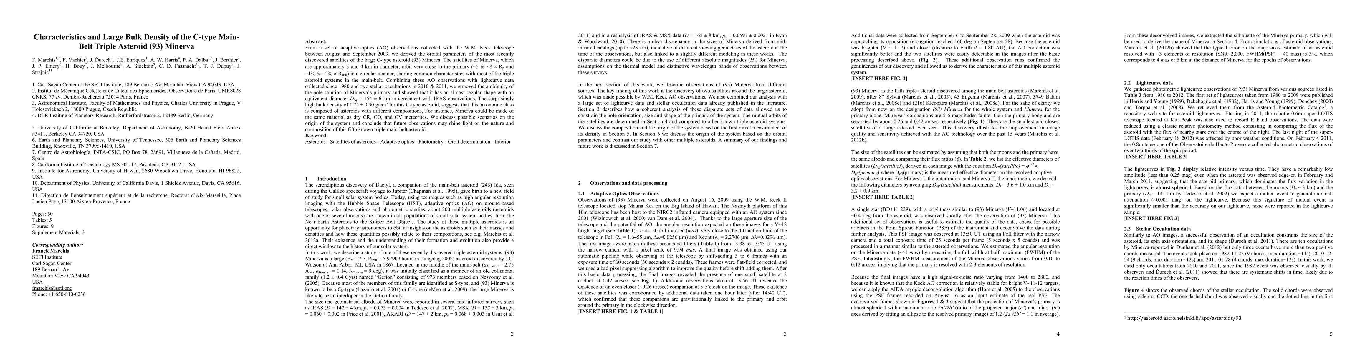 From a set of adaptive optics (AO) observations collected with the W.M. Keck telescope between August and September 2009, we derived the orbital parameters of the most recently discovered satellites of the large C-type asteroid (93) Minerva. The satellites of Minerva, which are approximately 3 and 4 km in diameter, orbit very close to the primary $\sim$5 & $\sim$8 $\times$ Rp and $\sim$1% & $\sim$2% $\times$ RHill) in a circular manner, sharing common characteristics with most of the triple asteroid systems in the main-belt. Combining these AO observations with lightcurve data collected since 1980 and two stellar occultations in 2010 & 2011, we removed the ambiguity of the pole solution of Minerva's primary and showed that it has an almost regular shape with an equivalent diameter Deq = 154 $\pm$ 6 km in agreement with IRAS observations. The surprisingly high bulk density of 1.75 $\pm$ 0.30 g/cm$\^3$ for this C-type asteroid, suggests that this taxonomic class is composed of asteroids with different compositions, For instance, Minerva could be made of the same material as dry CR, CO, and CV meteorites. We discuss possible scenarios on the origin of the system and conclude that future observations may shine light on the nature and composition of this fifth known triple main-belt asteroid.