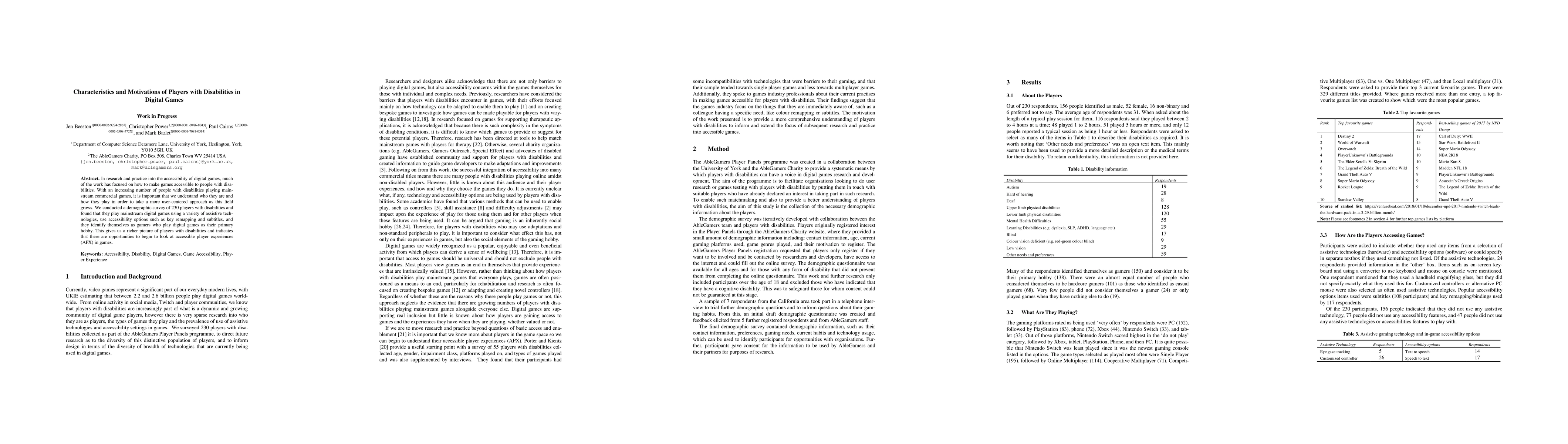 This study surveys 230 players with disabilities to understand their gaming habits and motivations, revealing they use various assistive technologies and accessibility features, emphasizing the need for a user-centered approach to enhance accessible player experiences in digital games.
