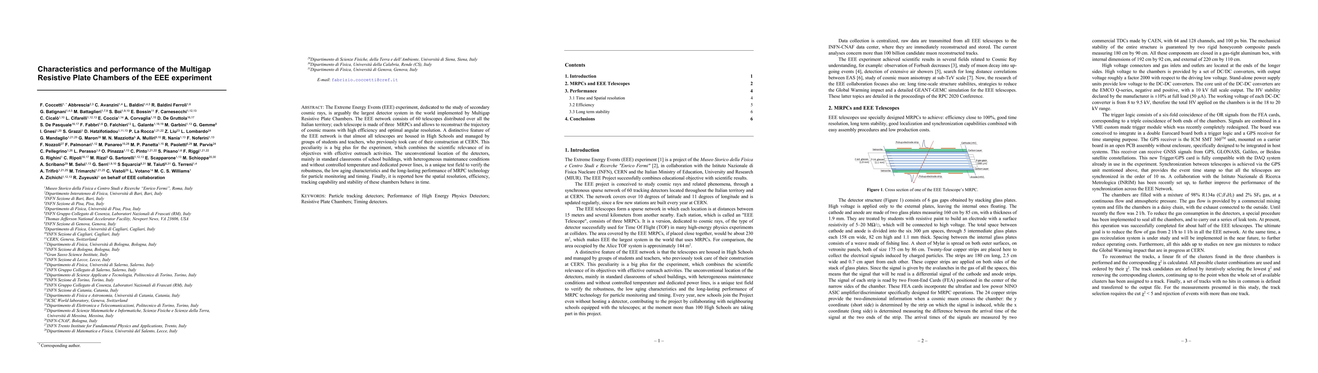 The EEE experiment utilizes a network of 60 Multigap Resistive Plate Chambers (MRPCs) across Italy to study secondary cosmic rays, demonstrating high efficiency and angular resolution in cosmic muon trajectory reconstruction. The experiment's unique deployment in high schools showcases the robustness and long-term performance of MRPC technology under diverse conditions.