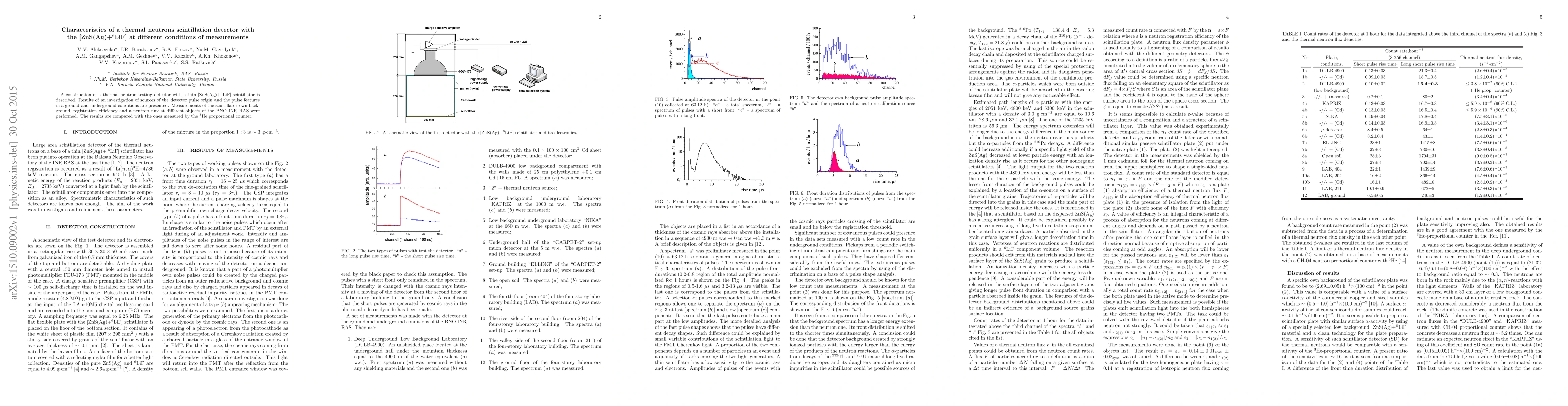 A construction of a thermal neutron testing detector with a thin [ZnS(Ag)+$^6$LiF] scintillator is described. Results of an investigation of sources of the detector pulse origin and the pulse features in a ground and underground conditions are presented. Measurements of the scintillator own background, registration efficiency and a neutron flux at different objects of the BNO INR RAS were performed. The results are compared with the ones measured by the $^3$He proportional counter.