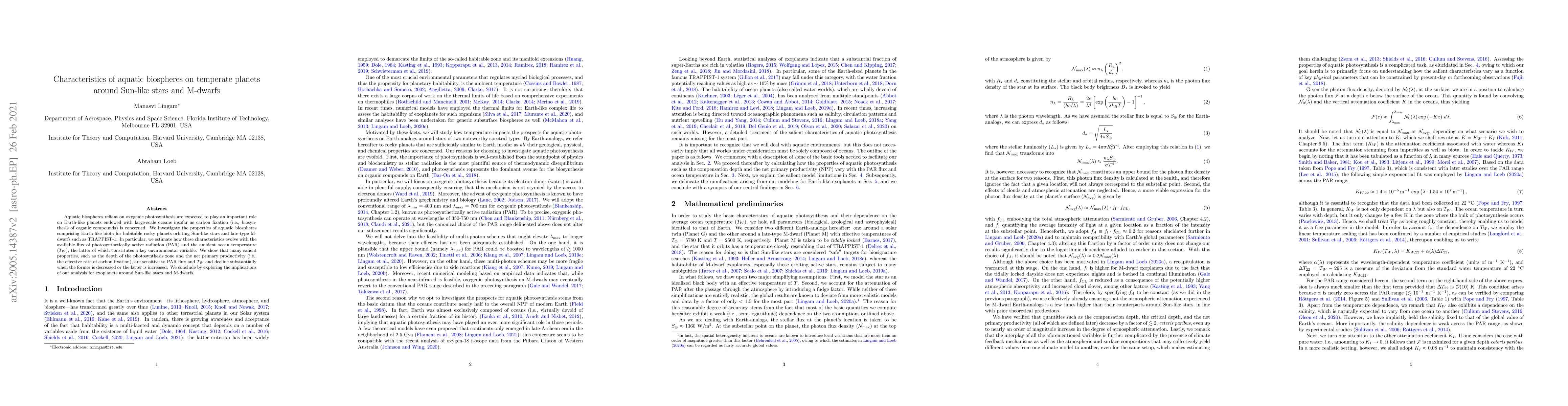 This research examines aquatic biospheres on Earth-like planets around Sun-like stars and M-dwarfs, focusing on how oxygenic photosynthesis affects carbon fixation. It finds that properties like the depth of the photosynthesis zone and net primary productivity are significantly influenced by the photosynthetically active radiation flux and ocean temperature.