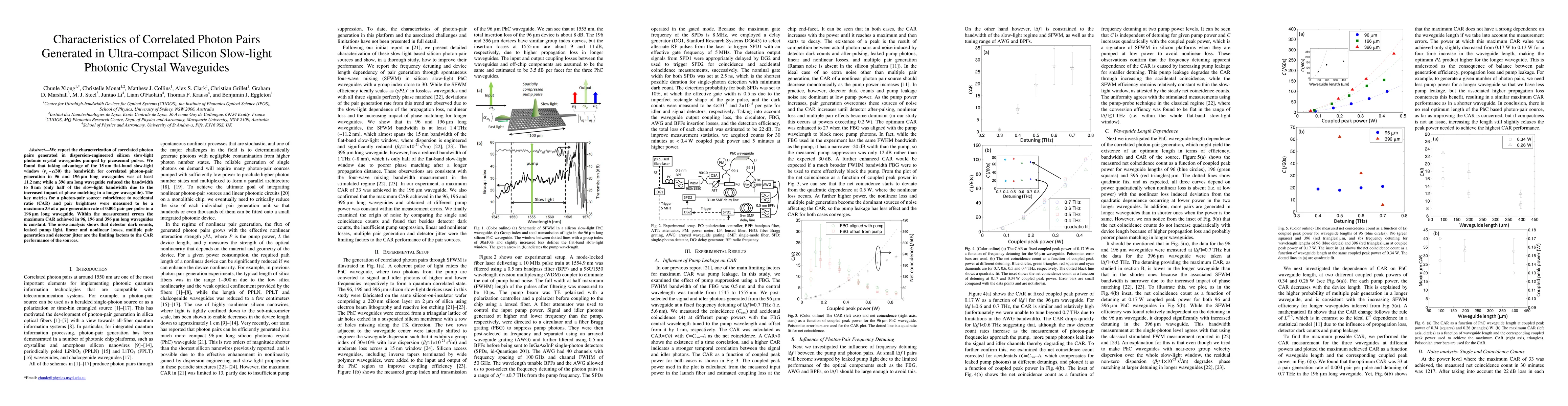 This paper characterizes photon pairs generated in silicon slow-light photonic crystal waveguides, finding that waveguide length significantly affects bandwidth and pair generation rates. The best performance, with a maximum coincidence to accidental ratio of 33, was achieved in 196 µm long waveguides.
