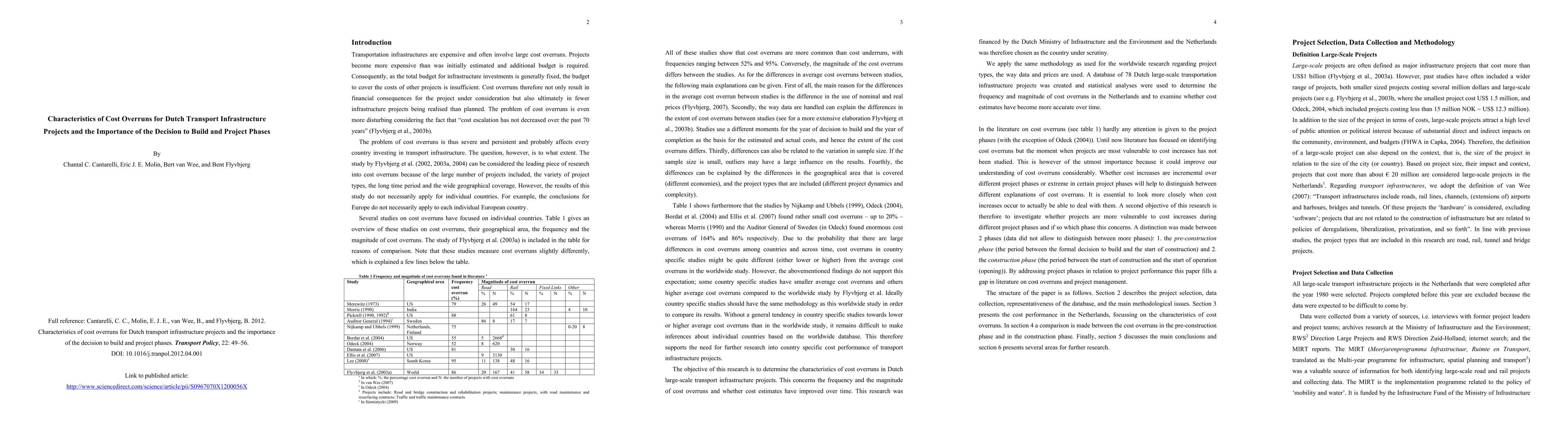 Using a methodology similar to that used the in the worldwide research, the cost performance of Dutch large-scale transport infrastructure projects is determined. In the Netherlands, cost overruns are as common as cost underruns but because cost overruns are larger than cost underruns projects on average have a cost overrun of 16.5%. The focus on one country further enabled to consider cost overruns during different project development phases. It turned out that in the Netherlands the majority of the cost overrun occurs in the pre-construction phase (the period between the formal decision to build and the start of construction). The frequency as well as the magnitude of pre-construction cost overrun is significantly higher than in the construction phase. The used methodology of calculating cost overruns does however not take lock-in into account. This phenomenon shows that the real decision to build was taken much earlier in the decision-making process. Since estimated costs are usually lower during these earlier stages, the cost overruns based on this real decision to build are likely to be much higher. Cost overruns presented in studies are therefore often underestimated and the problem of cost overruns is much larger than we think.