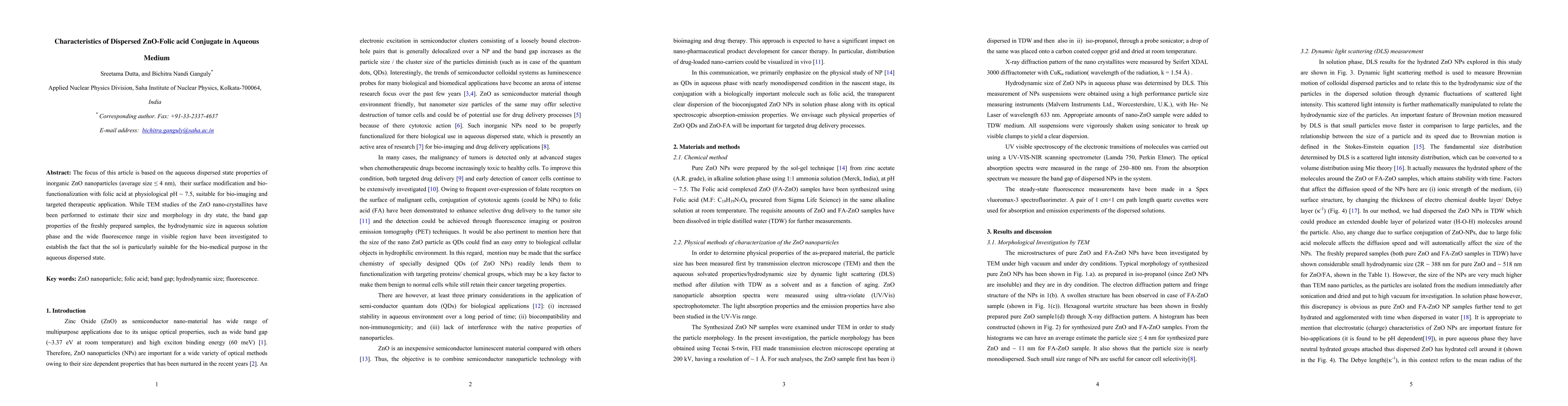 The focus of this article is based on the aqueous dispersed state properties of inorganic ZnO nanoparticles (average size lessthan or equal to 4 nm), their surface modification and bio-functionalization with folic acid at physiological pH ~ 7.5, suitable for bio-imaging and targeted therapeutic application. While TEM studies of the ZnO nano-crystallites have been performed to estimate their size and morphology in dry state, the band gap properties of the freshly prepared samples, the hydrodynamic size in aqueous solution phase and the wide fluorescence range in visible region have been investigated to establish the fact that the sol is particularly suitable for the bio-medical purpose in the aqueous dispersed state. Key words: ZnO nanoparticle; folic acid; band gap; hydrodynamic size; fluorescence.