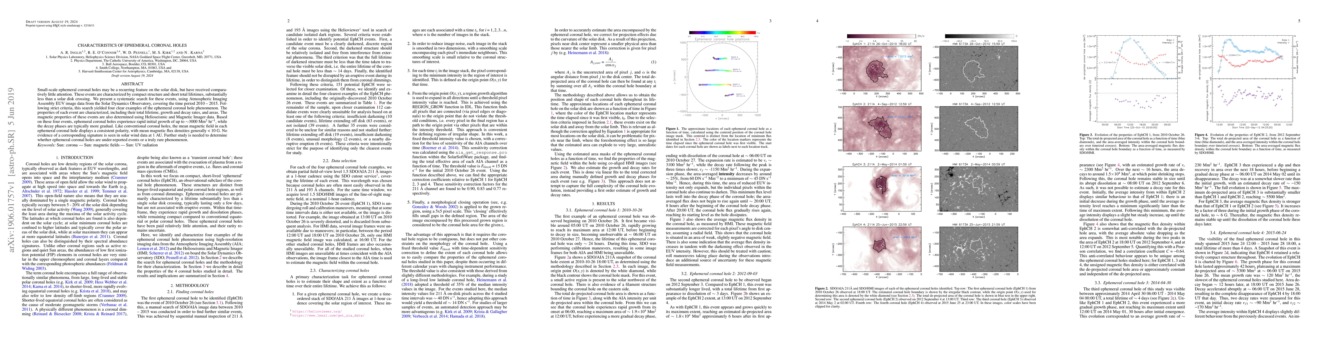 This study identifies and characterizes four ephemeral coronal holes observed between 2010-2015 using EUV and magnetic data. These small, short-lived features exhibit rapid initial expansion and consistent magnetic polarity, but no corresponding signature in solar wind data.